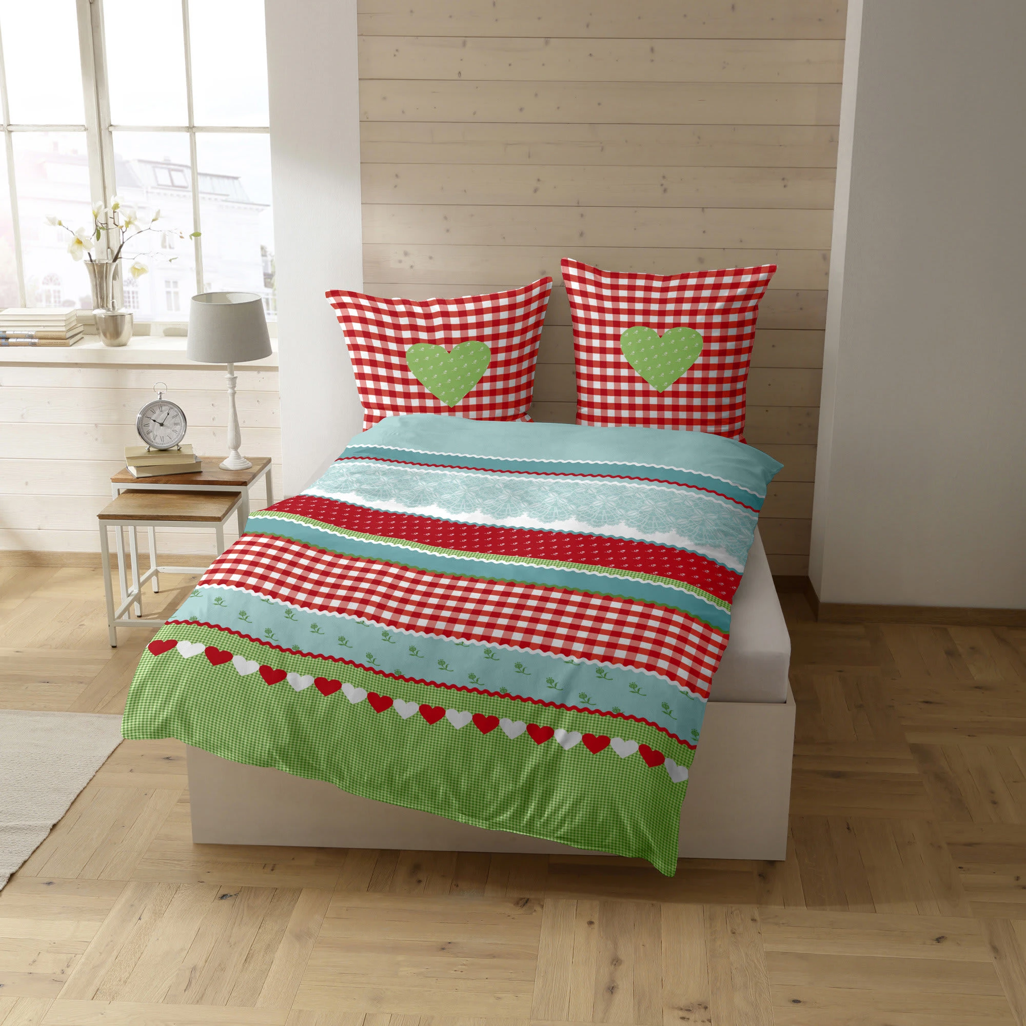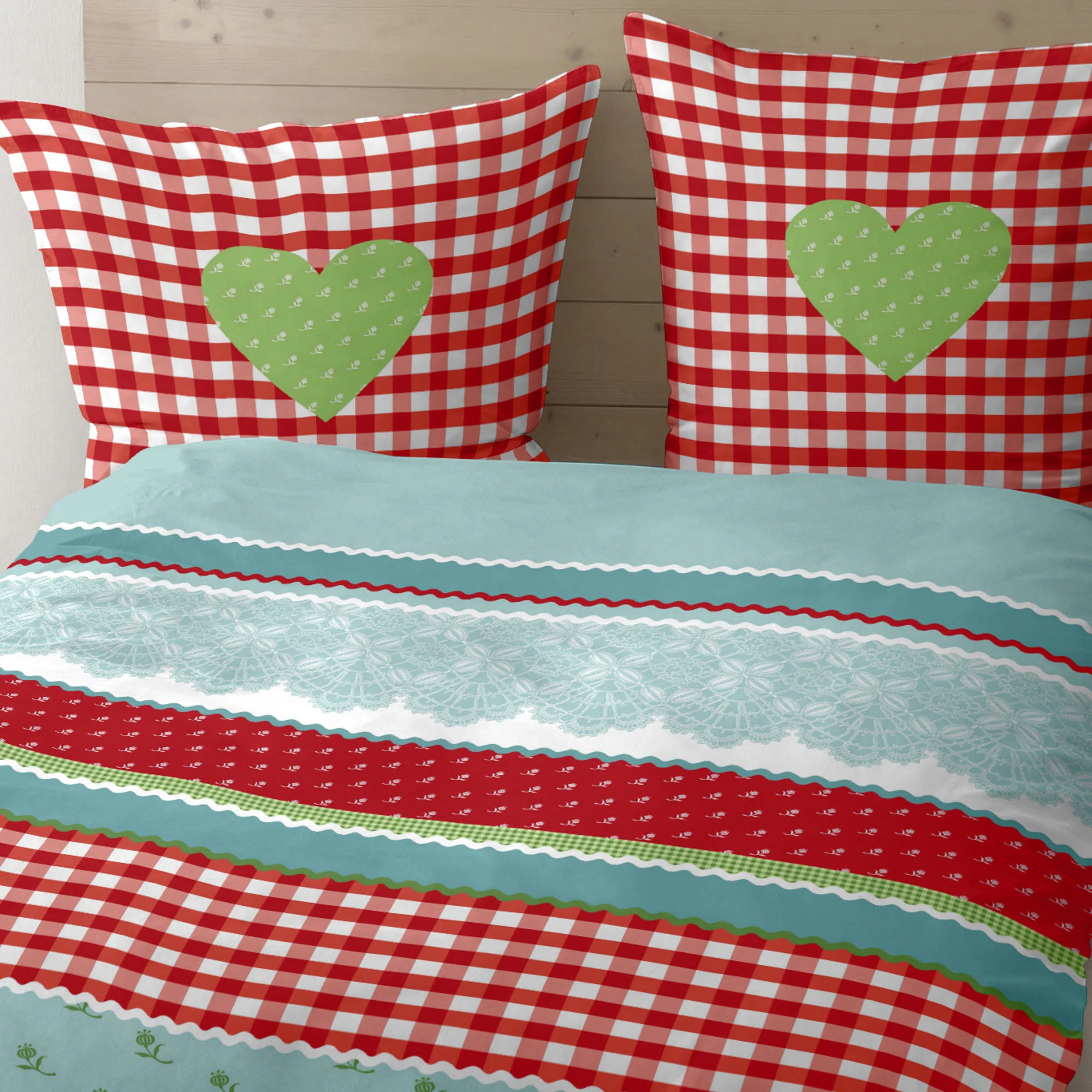 Casatex Renforcé Bettwäsche “Herz-Karo”. Karos, Herzchen und Spitzenbordüren zieren die romantisch verspielte Bettwäsche und verbreiten gemütlichen Landhaus-Chic. Fühlen Sie das glatte, hautfreundliche Gewebe mit dem angenehmen Griff, es ist herrlich weich, anschmiegsam, strapazierstark und temperaturausgleichend. Dank Reißverschluss leicht zu beziehen.