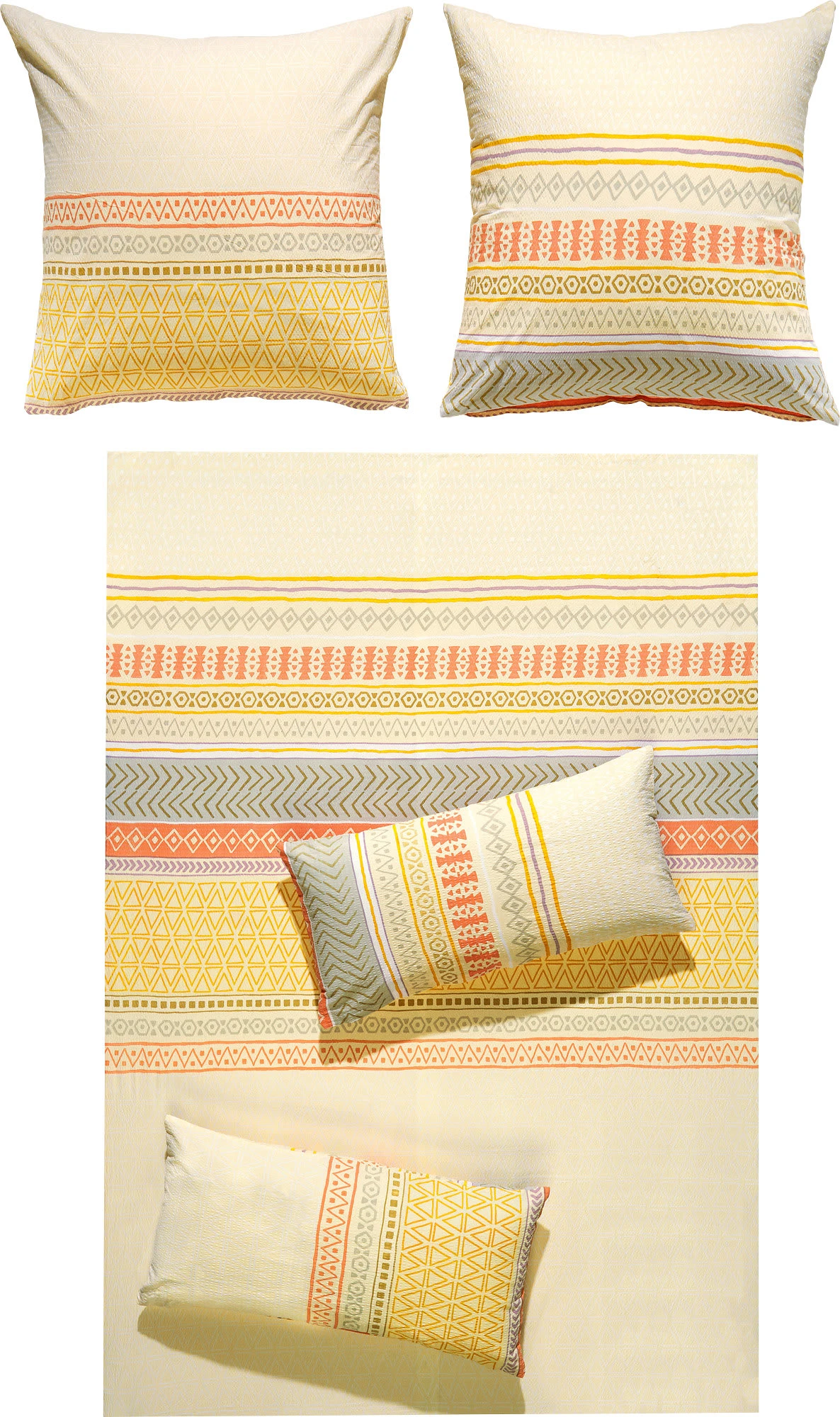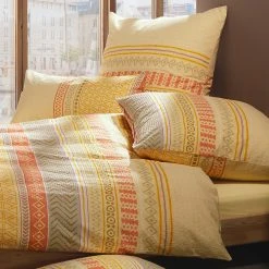Erwin Müller Seersucker Bettwäsche. Unterschiedliche Ethno-Muster – mal dezent und mal in Farbe – überziehen die charmante Komposition und bringen einen frischen Wind in Ihr Schlafambiente. Noch mehr Individualität verleiht ihr der Kissenbezug zum Wenden. Gerade im Sommer wird Sie die angenehm leichte, hautsympathische und temperaturausgleichende Qualität mit dem dauerhaften Kreppeffekt überzeugen. Sie ist unkompliziert in der Handhabung, schnell trocknend, bügelfrei und dank Reißverschluss rasch wieder bezogen.