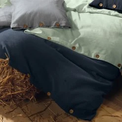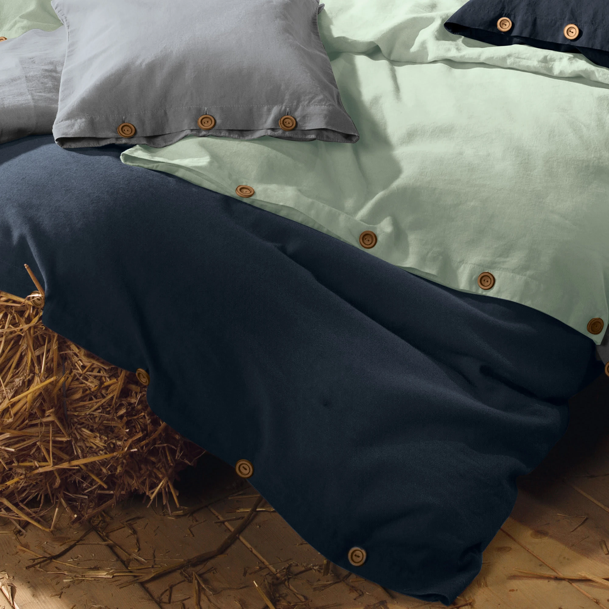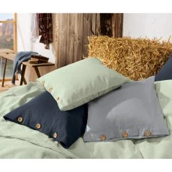 Erwin Müller Halbleinen Kuschelkissenbezug ”Deggendorf”. Puristische Raffinesse in zeitloser Schönheit. Der besondere Materialmix, ein robustes und dennoch anschmiegsames Baumwoll-Leinen-Gemisch, wirkt naturalistisch und ursprünglich. Seine typische Struktur und der edle Knittertouch sind charakteristisch, rustikale Holzknöpfe verleihen der Optik den letzen Schliff. Der weich vorgewaschene Stoff fühlt sich an warmen Tagen angenehm kühlend und wohltuend an. Er ist sehr atmungsaktiv, hautschmeichelnd und feuchtigkeitsregulierend. Die besten Voraussetzungen für ein erholsames, entspanntes Schlafvergnügen.