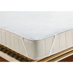 Erwin Müller wasserdichte Frottee-Matratzenauflage. Der weiche, strapazierfähige Stoff überzeugt durch seine hohe Feuchtigkeitsaufnahme. So wird der gesamte Matratzenbereich geschont. Die Fix-Spannauflage ist temperaturausgleichend und sorgt für ein angenehmes Schlafklima. Hautsympathisch, atmungsaktiv und feuchtigkeitsabsorbierend. Auf der Unterseite befindet sich eine Nässesperre aus Polyurethan. Rundum mit Bandeinfassung. Dank Übereck-Gummibänder schnell und mühelos aufgezogen für einen festen Halt auf der Matratze. Kochfest und trocknergeeignet.