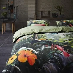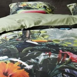Bringen Sie mit der Wendebettwäsche Gabriel von Essenza neue Farbe in Ihre Schlafzimmer. Das beeindruckende Dschungel-Motiv in warmen Farben ziert sowohl die Vorderseite des Bettbezuges, als auch den Kissenbezug. Die Abseite der Garnitur präsentiert sich in einem angenehm weichen Grünton und rundet das Design harmonisch ab. Schmiegen Sie sich in die weiche und geschmeidige Satin Oberfläche aus 100 Prozent Baumwolle und genießen Sie allerbesten Schlafkomfort.