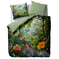 Bringen Sie mit der Wendebettwäsche Gabriel von Essenza neue Farbe in Ihre Schlafzimmer. Das beeindruckende Dschungel-Motiv in warmen Farben ziert sowohl die Vorderseite des Bettbezuges, als auch den Kissenbezug. Die Abseite der Garnitur präsentiert sich in einem angenehm weichen Grünton und rundet das Design harmonisch ab. Schmiegen Sie sich in die weiche und geschmeidige Satin Oberfläche aus 100 Prozent Baumwolle und genießen Sie allerbesten Schlafkomfort.