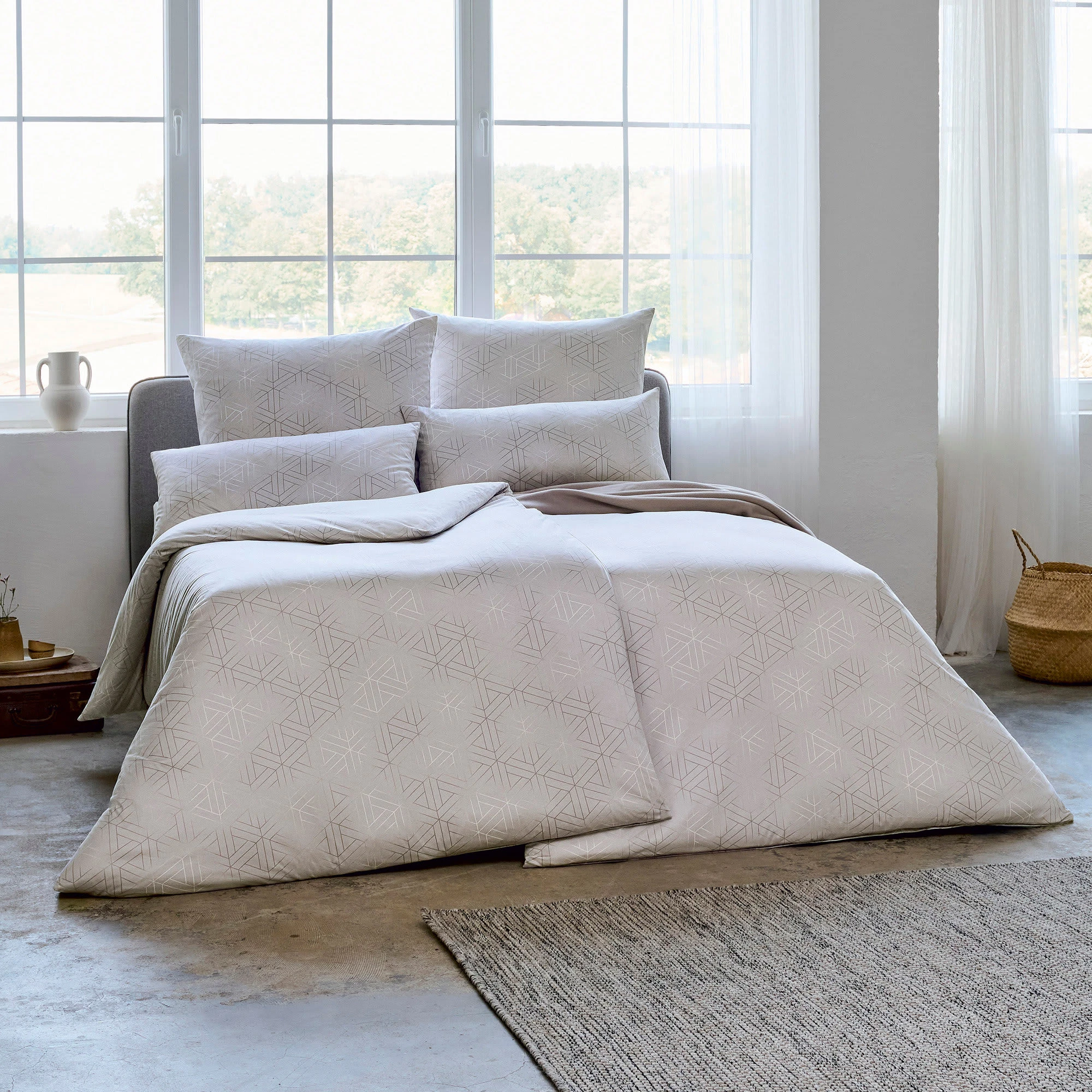 Estella Mako-Interlock-Jersey Bettwäsche “Pippa”. Das extravagante Grafikmuster integriert sich perfekt in Schlafzimmer mit einem zeitgemäßen Einrichtungsstil. Diese Qualität gehört zur absoluten Spitzenklasse. Sie sehen es am exquisiten Dessin und fühlen es beim ersten prüfenden Griff. Erleben Sie höchsten Schlafkomfort. Durch edelste Rohbaumwolle und die sehr feine Strickung ist diese Bettwäsche aus supergekämmten, mercerisierten Garnen besonders hautsympathisch und temperaturausgleichend – die ideale “Vier-Jahreszeiten-Bettwäsche”. Pflegeleicht, bügel- und absolut pillingfrei. Mit arbeitssparendem Reißverschluss.