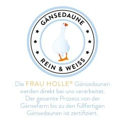 Frau Holle garantiert handwerkliche deutsche Qualität und ausgewählte beste Materialien für Hülle und Füllung. Feine, leichte Daunenbettdecke für das ganze Jahr und auch für beheizte Schlafzimmer. Besonders bauschig, weich und atmungsaktiv. Gefüllt mit feinen europäischen Gänsedaunen und -federn. Die Daunen und Feder sind DOWNPASS zertifiziert und stammen nachweisbar NICHT aus dem Lebendrupf, sondern aus artgerechter Tierhaltung und -verpflegung. Die ideale feine Bettdecke für das ganze Jahr.