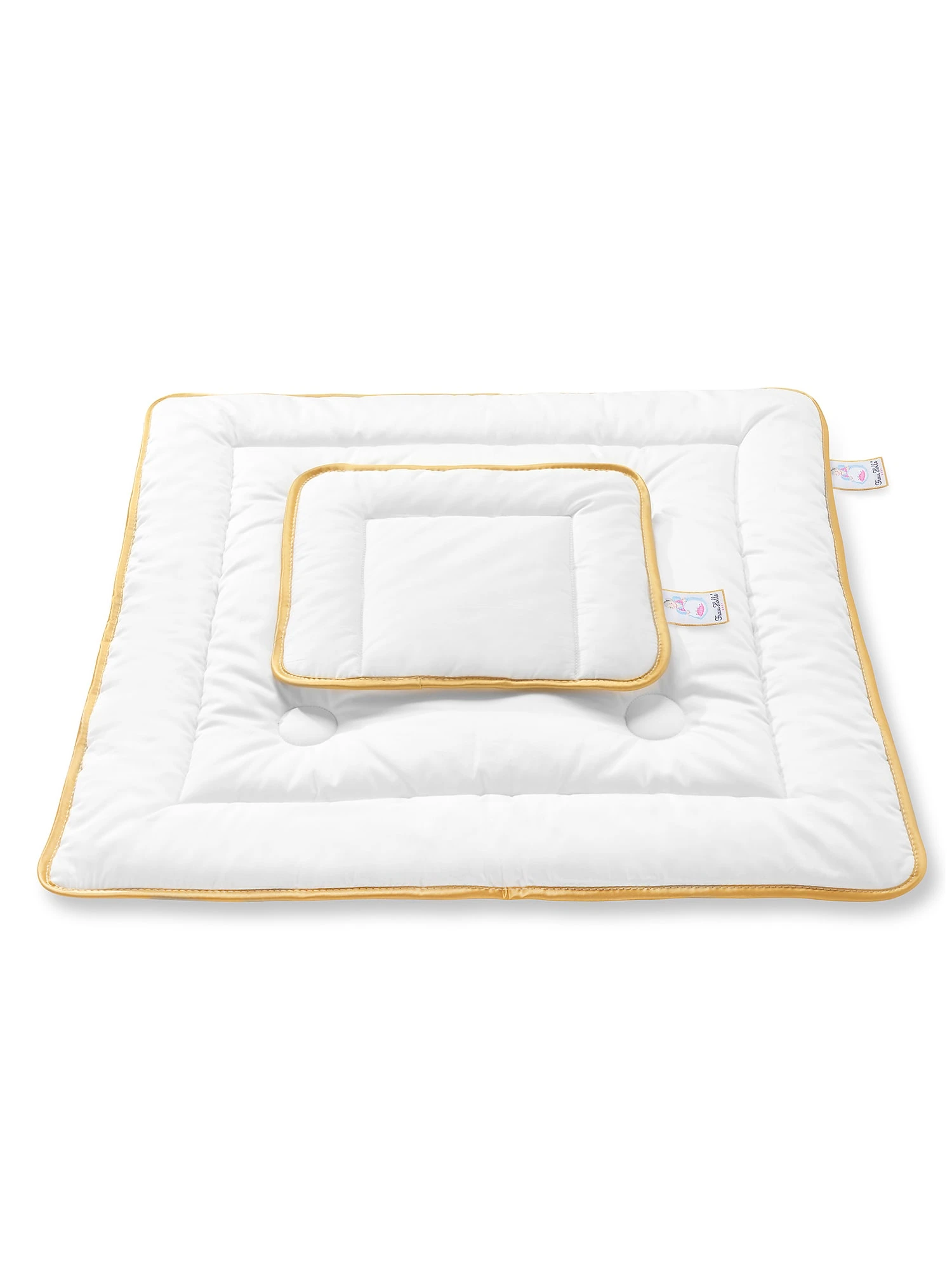 Babyset bestehend aus Babykopfkissen (35x40cm) und Babybettdecke (80×80 cm), gefüllt mit 100 % feinster Bio-Baumwolle, umhüllt mit GOTS zertifizierter Bio-Baumwolle. Kuschelig weich und sanft, sehr pflegeleicht, ideal für den besten Babyschlaf.