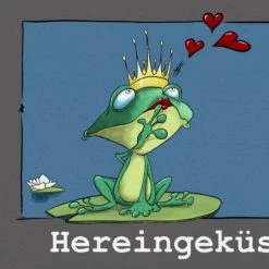 > Motiv: küssender Frosch und Schrift “Hereingeküsst…”