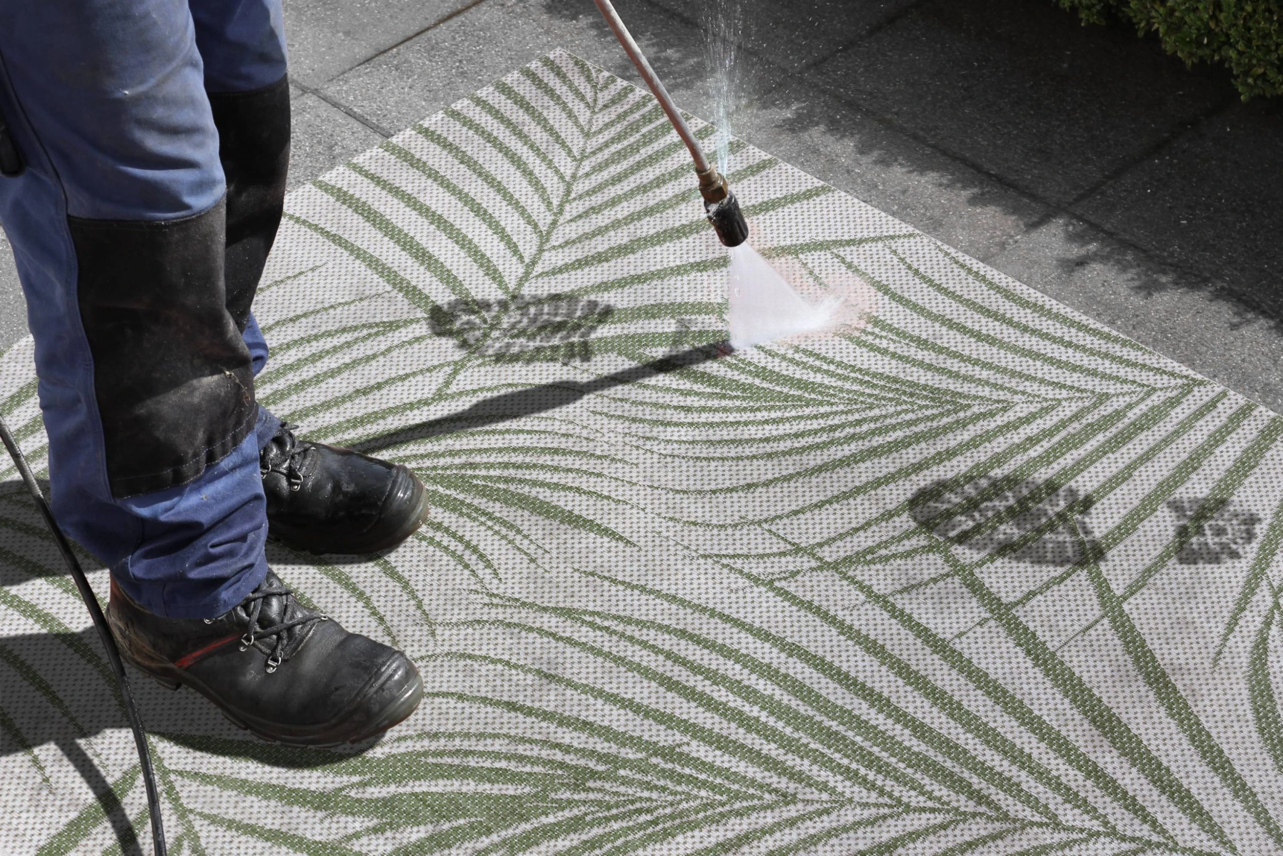 Der Gartenteppich besteht zu 100 % aus Polypropylen – einem robusten, wetterbeständigen Material, sodass er Sonne, Wind und Regen problemlos standhält.