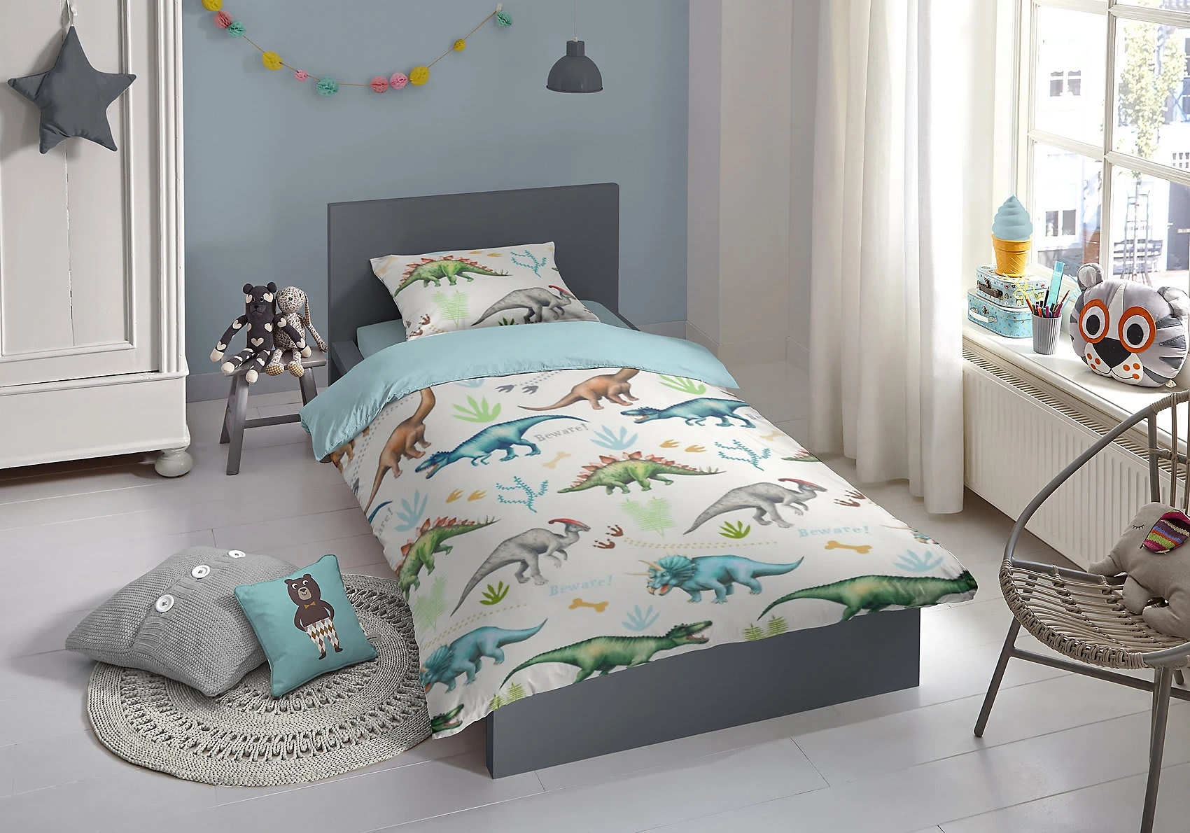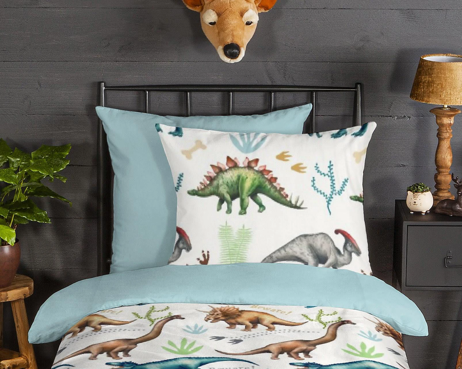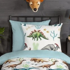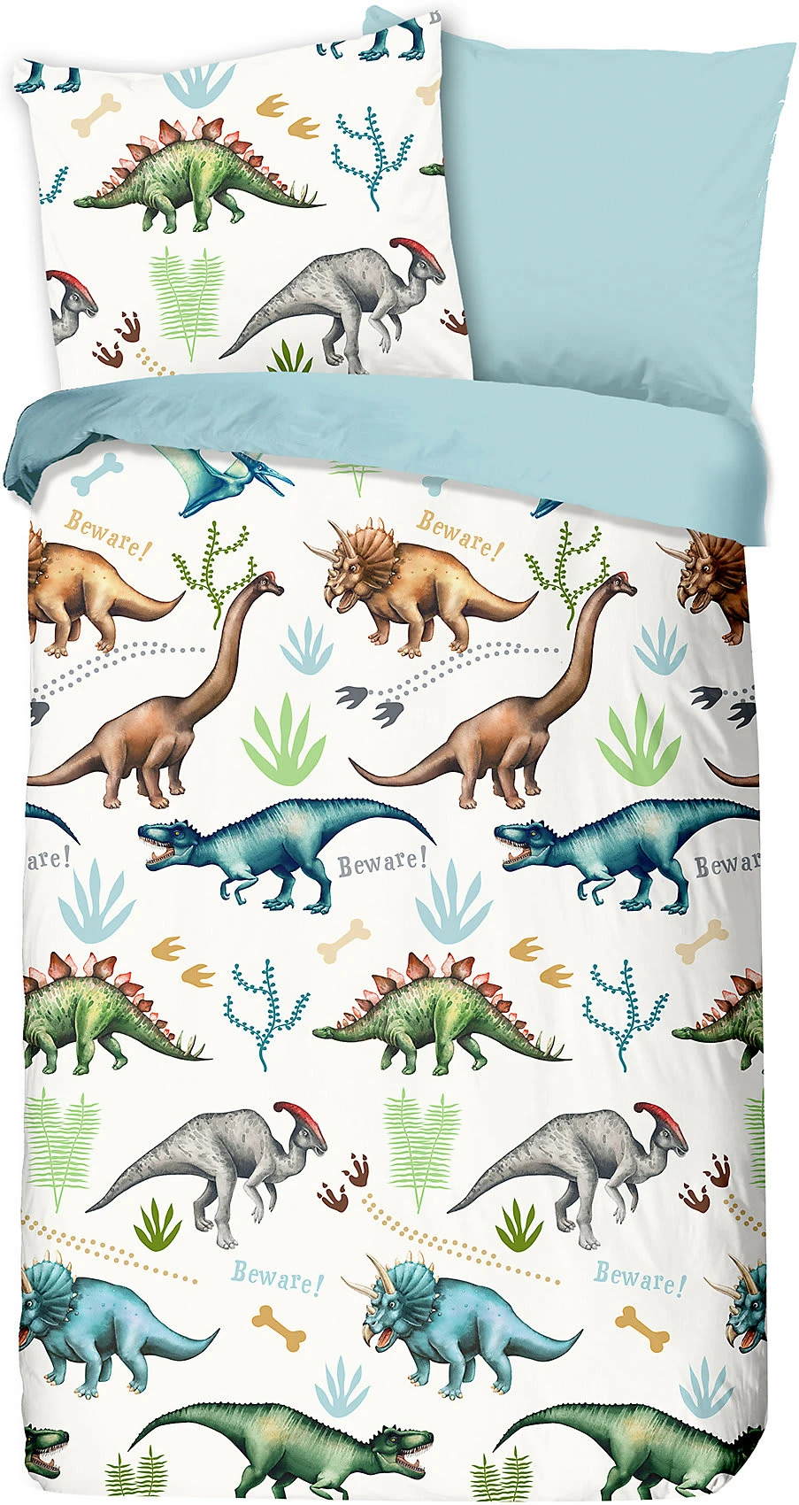 Good Morning Flanell Kinder-Wendebettwäsche “Dino”. Fans der faszinierenden Urzeit-Giganten kommen mit der spannenden Bettwäsche voll auf ihre Kosten. Im hochwertigen Digitaldruck für dauerhafte Farbbrillanz. Das Allover-Motiv wird von der einfarbigen Rückseite in Farbe Hellblau stimmig abgerundet. Welch ein Genuss, sich in die wolkenweiche, samtig angeraute Wohlfühlqualität zu kuscheln. Sie verwöhnt mit wohliger Wärme, fühlt sich herrlich soft auf der Haut an, ist temperaturausgleichend und atmungsaktiv. Unkompliziert zu beziehen durch den praktischen Reißverschluss.