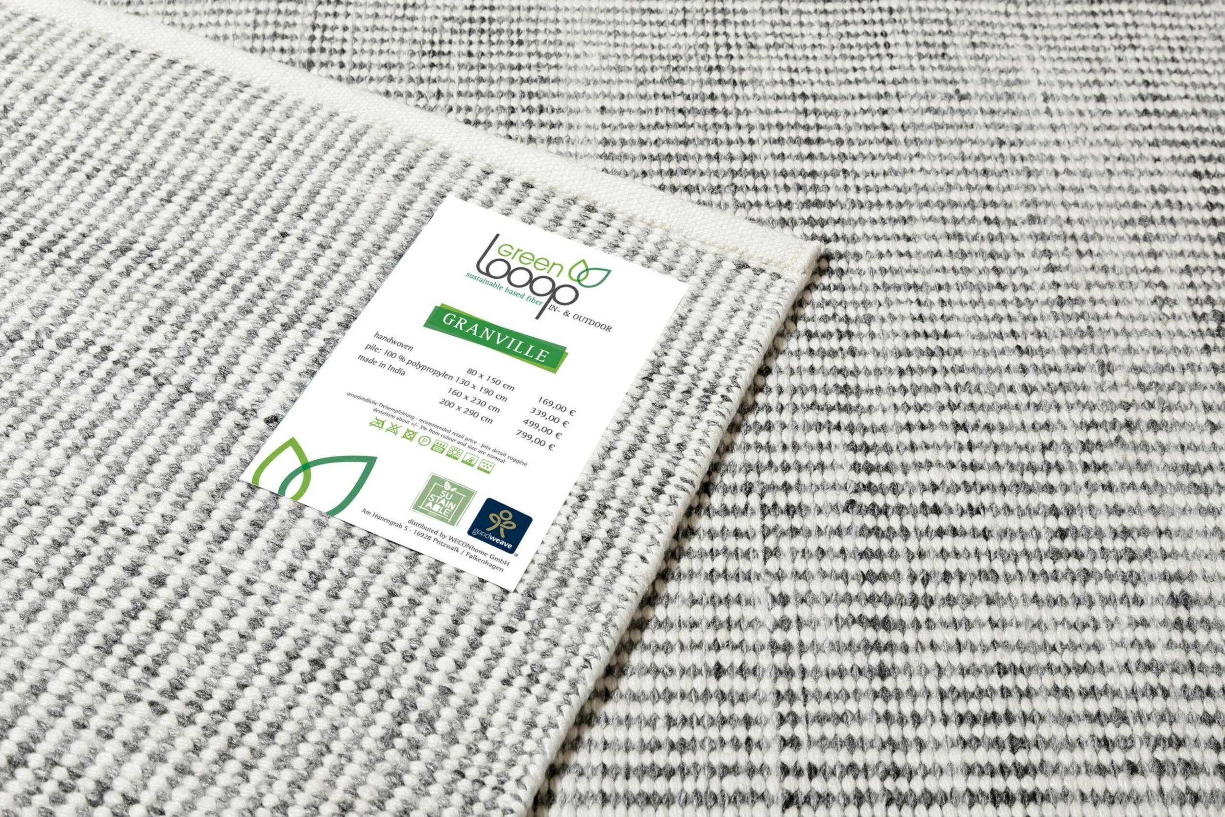 Der handgewebte Kurzflor-Teppich »Granville« von Green Looop ist ein moderner Teppich, der sowohl Indoor- als auch Outdoor eingesetzt werden kann. Hochwertig in seiner Verarbeitung und schön im Design fügt sich Granville in viele Umgebungen perfekt ein. Terrasse, Garten und Balkon werden durch ihn zu einem besonderen Platz. Und auch Innen ist er ein gern gesehenes Accessoire. Granville ist mit dem GoodWeave-Siegel ausgestattet und ein wahrer Allrounder. Er schafft eine wohnliche Atmosphäre und ist absolut pflegeleicht, robust und UV-beständig. Granville ist ein echter Lieblingsteppich, der bei Teppichfans immer Saison hat.