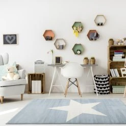 Ein behagliches Wohlfühlambiente vermittelt der wunderschöne Teppich “SHOOTINGSTAR” mit seinem tollen Farbkonzept und dem schönen Motiv. Der blaue Teppich wird durch einen großen Stern in Weiss ergänzt, der Kinderaugen zum Strahlen bringt. Eine Wohltat für die Füße ist der Kinderzimmerteppich ebenfalls, der dichte und hohe Flor fühlt sich einfach toll an. Dieser trendige Teppich ist einfach ein Muss im Kinderzimmer – oder anderen Wohnräumen.