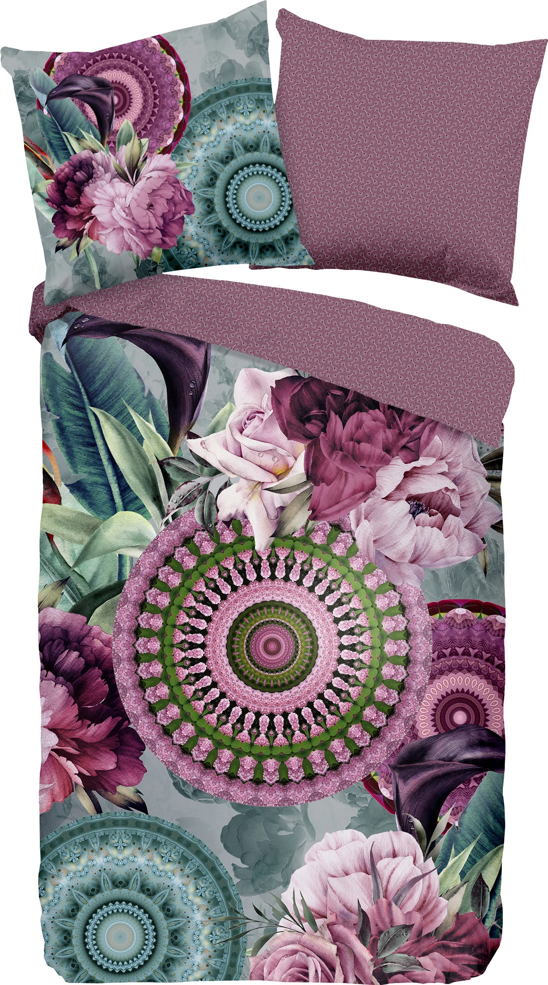 Hip Satin Wendebettwäsche “Bandhura”. Spielend schafft das zauberhafte Dessin den Spagat zwischen Romantik-Look und Boho-Charme. Was an den fantasievollen Mandalas, den wunderschönen Blumen sowie der bestechenden Farbharmonie liegt. Ein feines grafisches Muster überzieht die Rückseite und setzt einen stimmigen Kontrast. Die feinfädige, glatte Qualität ist ein hautschmeichelnder Genuss. Sie verführt durch ihren seidigen Glanz und den anschmiegsamen Griff. Schnell bezogen dank praktischem Reißverschluss.