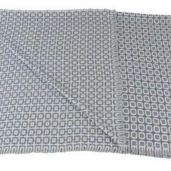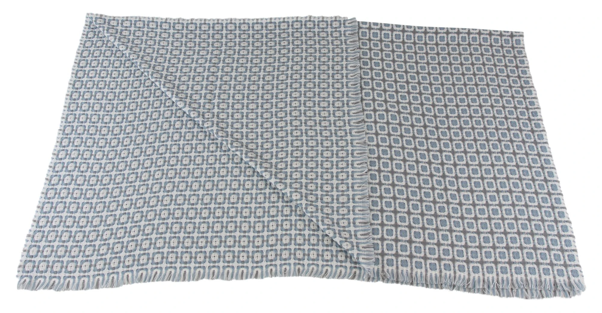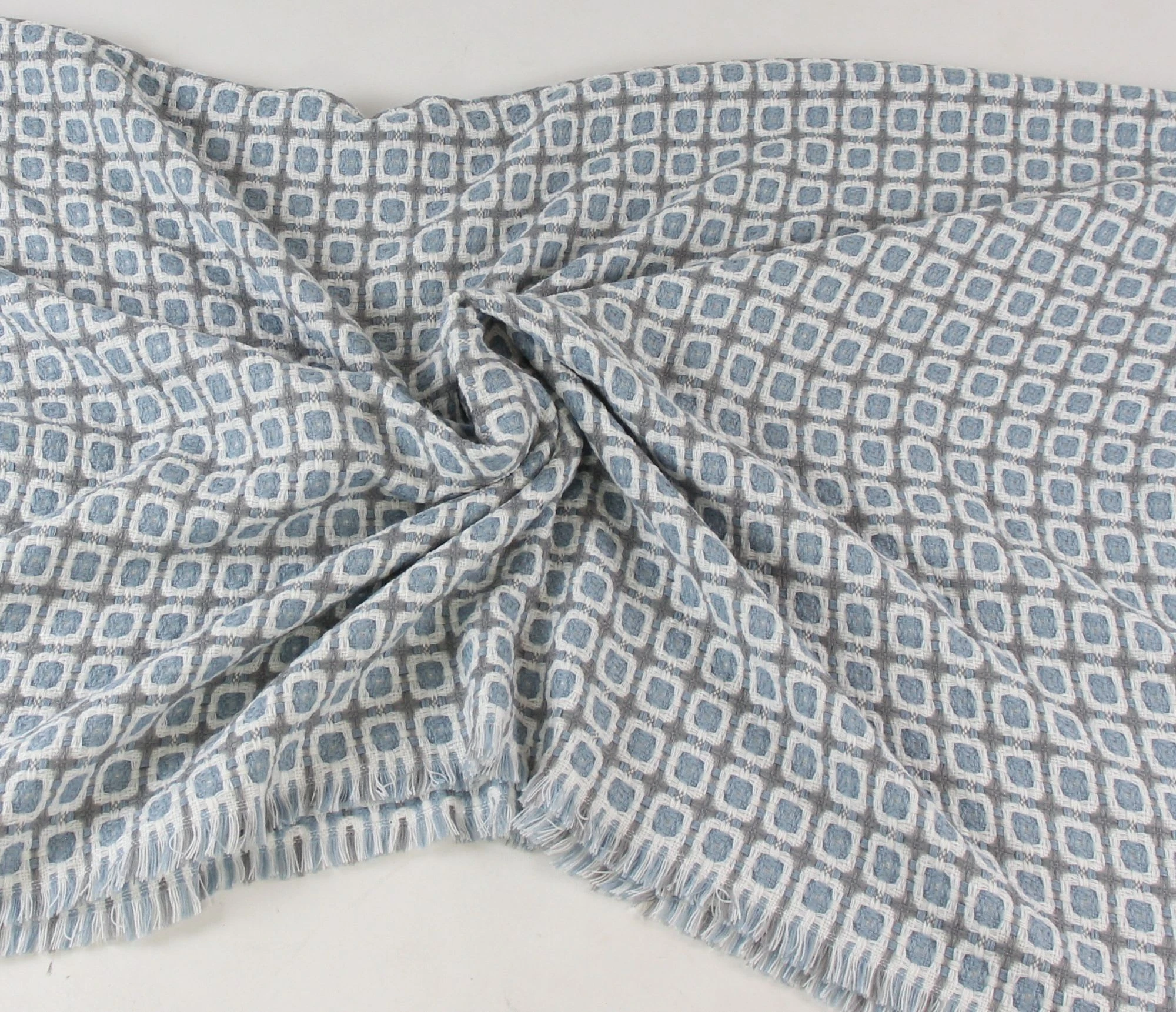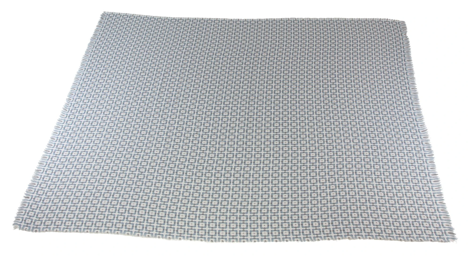 cremefarbener Grundstoff, sehr weich, Muster in Blau und Grau, Fransensaum, 100% Polyacryl