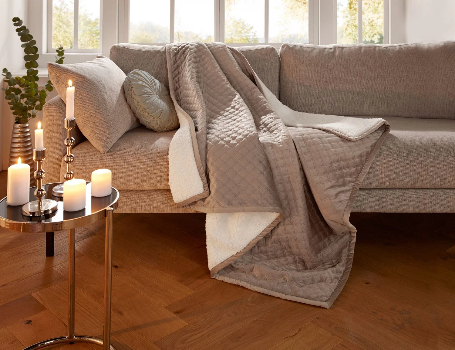 extra weich und anschmiegsam, leicht glänzende Flechtoptik, taupefarben, Rückseite flauschiger Teddystoff, weiß, 100% Polyester