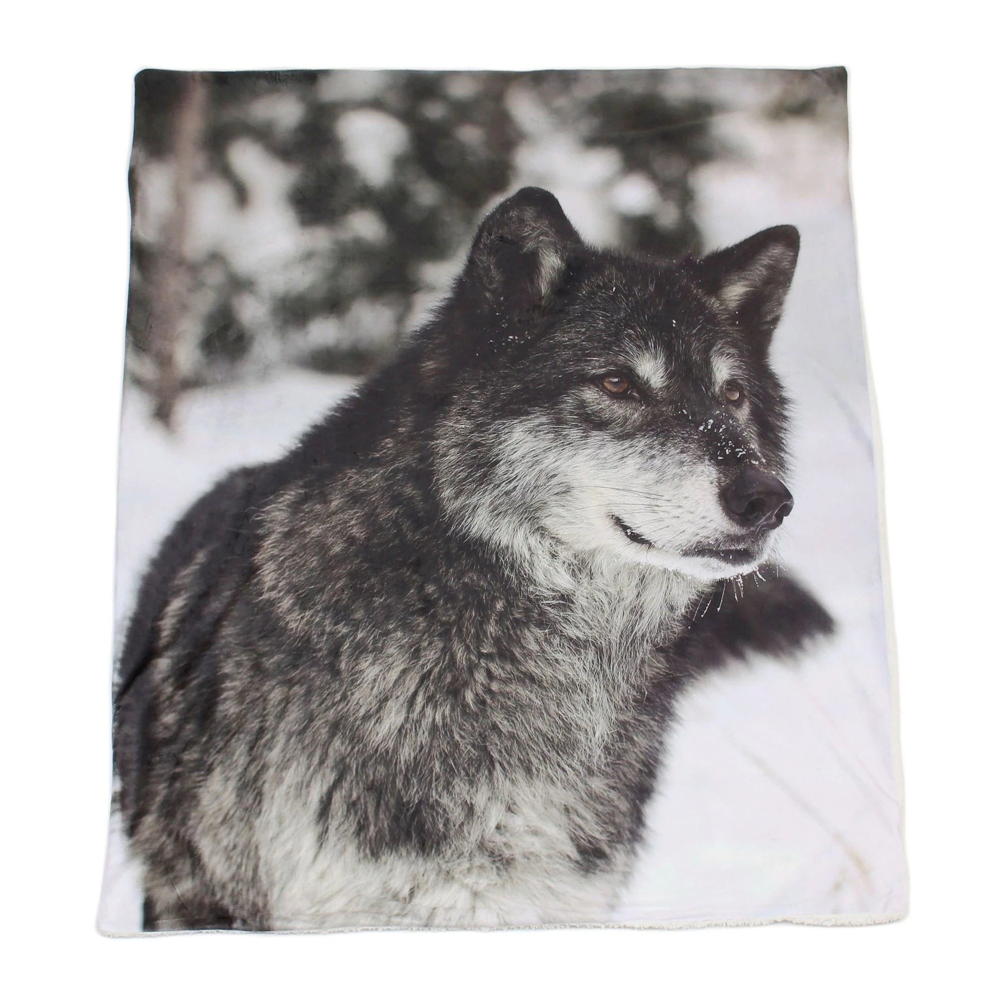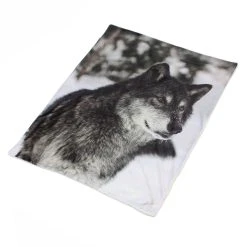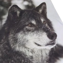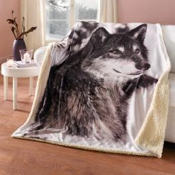 Vorderseite bedruckt mit naturgetreuem Wolfmotiv, Rückseite flauschiger Teddystoff, 100% Polyester
