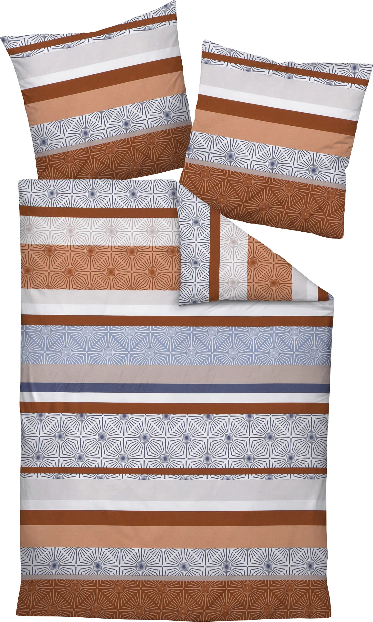 Janine Mako-Satin Bettwäsche. Modern und abwechslungsreich zeigt sich die Mischung aus Streifen und Grafikmustern im harmonischen Farbspiel. Mit Kissenbezug zum Wenden. Genießen Sie ein unvergessliches Schlaferlebnis in dem feinfädigen, glatten Gewebe, denn es ist atmungsaktiv, feuchtigkeitsregulierend und hautsympathisch. Mit Seidenfinish – supergekämmte, mercerisierte Garne verleihen dem sinnlichen Stoff seinen charakteristischen Seidenglanz. Pflegeleicht, bügelleicht und einfach zu beziehen dank praktischem Reißverschluss.