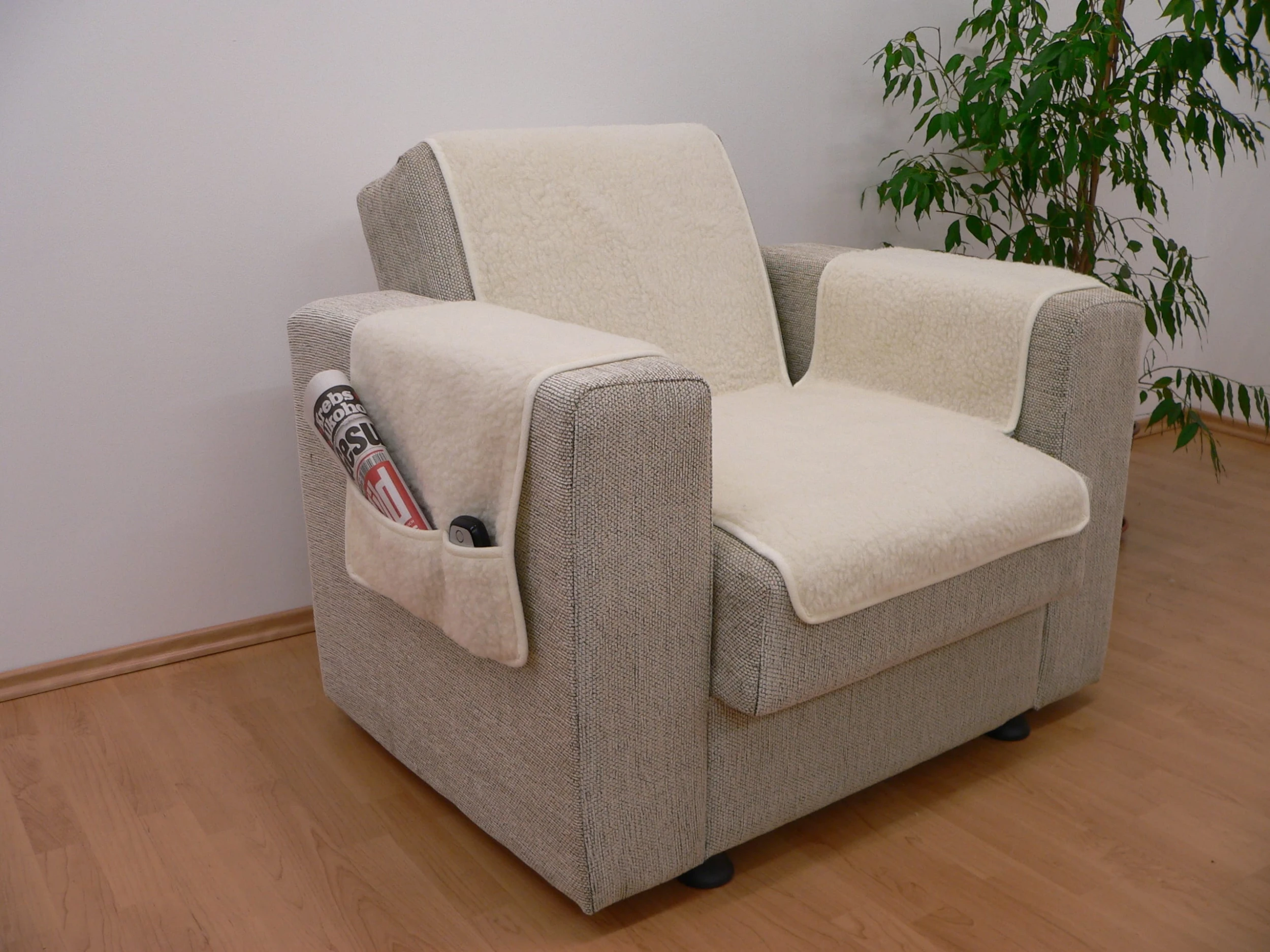 Set: Sessel- und Armlehnenschoner in zeitlosem, elegantem Design. Äußerst strapazierfähig und pflegeleicht. Mit unifarbenem Band eingefasst. Armlehnenschoner mit jeweils 2 Taschen. Größe: Sesselschoner 150×50 cm. Größe: Armlehnenschoner 70×40 cm