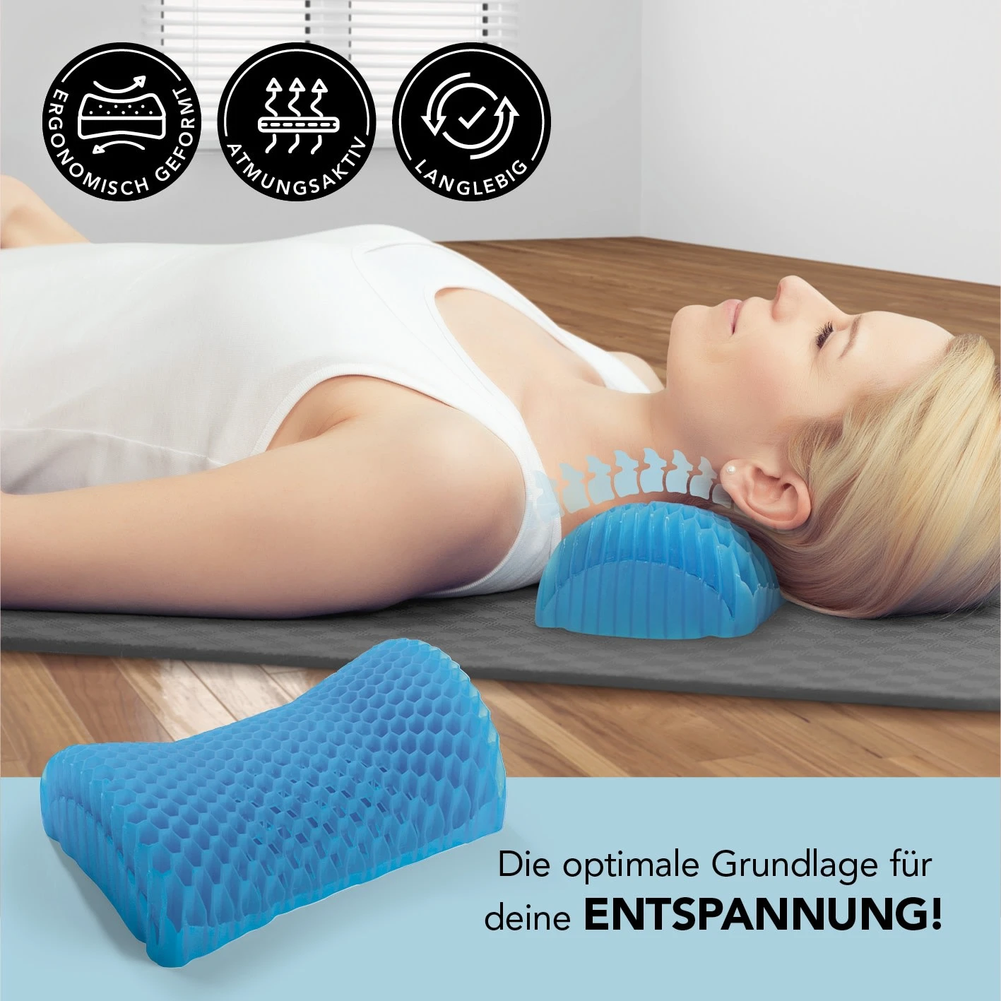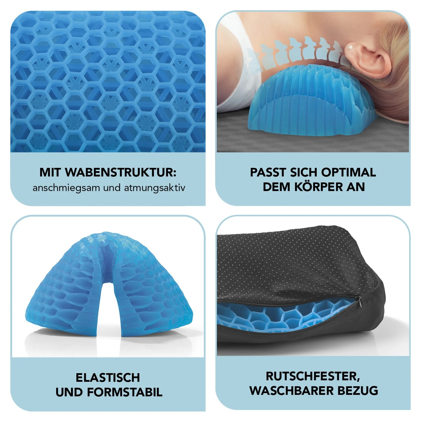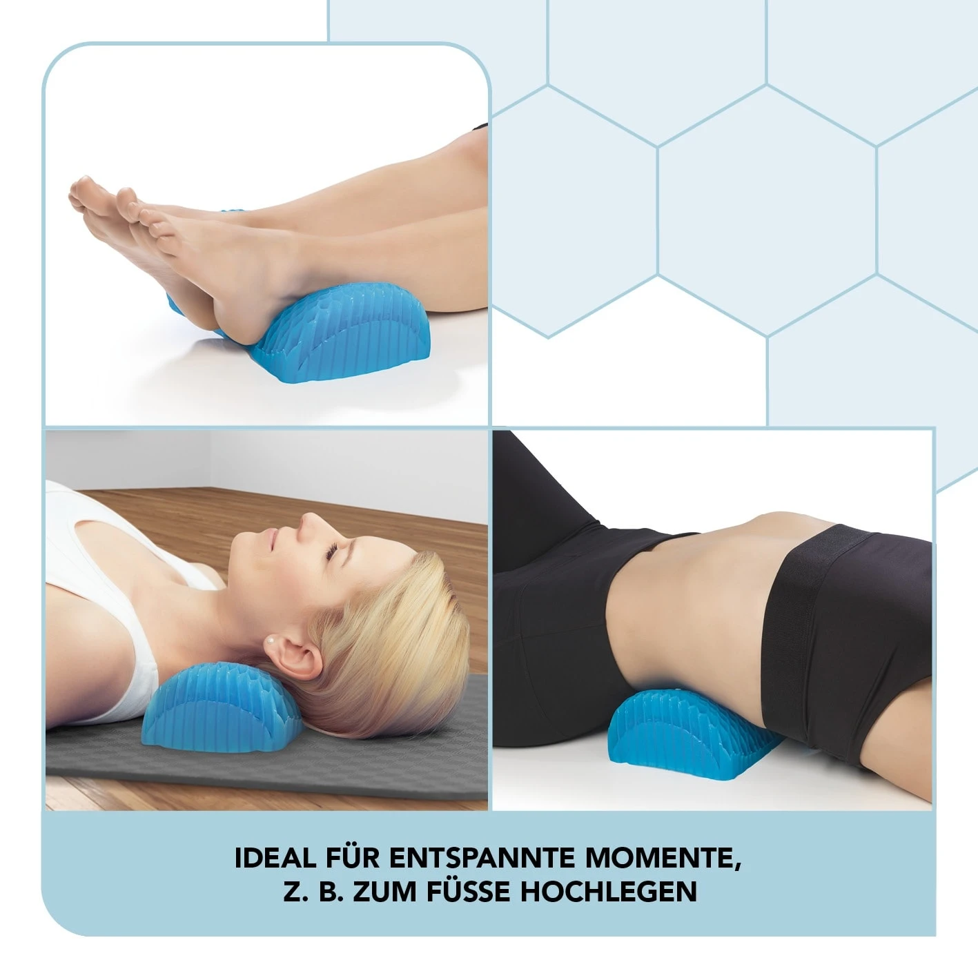 Das weiche und elastische Gelmaterial kehrt auch bei längerem Gebrauch immer wieder in seine ursprüngliche Form zurück. Verwende das Entspannungskissen mit Wabenstruktur immer und überall – zum Füße hochlegen, zum bequemeren Sitzen oder Liegen etc. – zuhause, auf Reisen und unterwegs!