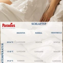 Die Daunenbettdecke Gabi 90 aus Paradies Gänsedaunen und -federn ist in der Wärmehaltung Ganzjahresdecke und in den Größen 135×200 cm und 155×220 cm erhältlich.