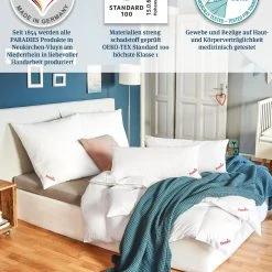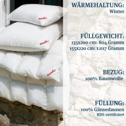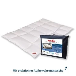 Die Daunenbettdecke Safina 100 aus hochwertigen, vollausgereiften Paradies 100% Gänsedaunen schenkt ein luxuriöses Schlafgefühl wie im Hotel. Die Daunendecke ist in zwei Wärmehaltungen und jeweils in den Größen 135×200 cm und 155×220 cm erhältlich: Ganzjahresbettdecke und Winterbettdecke