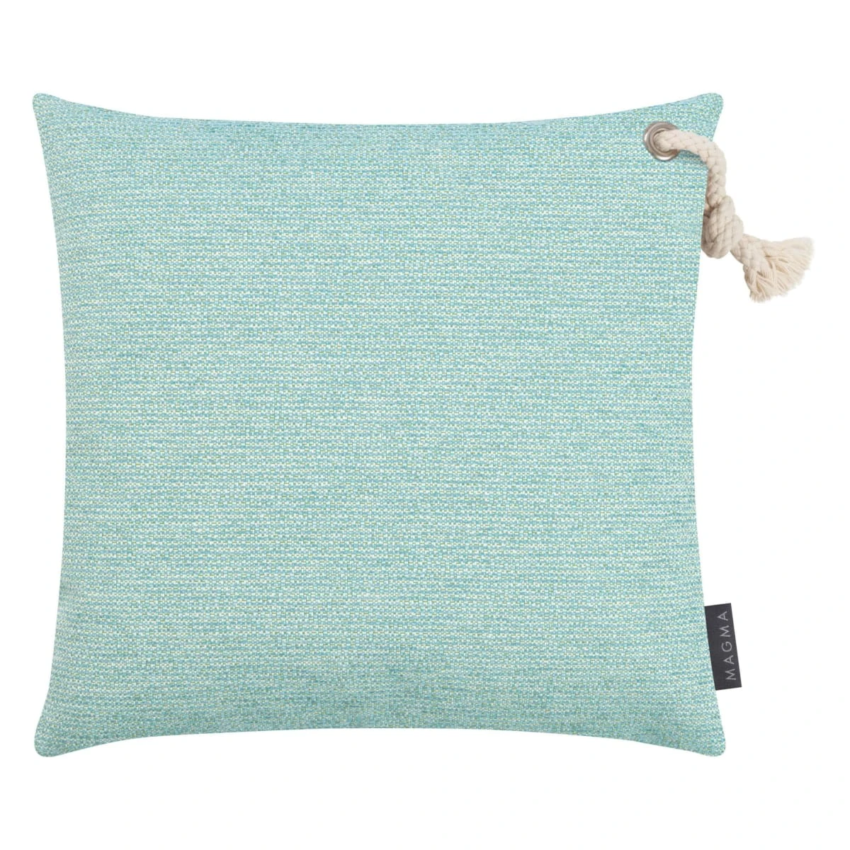 Modernes Outdoor-Kissen mit dekorativen Extras. Durch die spezielle Ausrüstung ist der Stoff wasser- und schmutzabweisend und kann so bei leichtem Regen auch mal draußen liegengelassen werden.