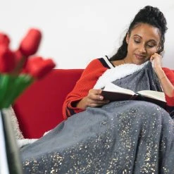 Was gibt es in der kalten Jahreszeit Besseres, als sich nach einem langen Arbeitstag mit einer Tasse Tee oder einer heißen Schokolade auf der Couch einzukuscheln? Die flauschige Wohndecke in Grau mit dekorativen goldenen Prints ist da genau das richtige Accessoire. Mit ihrer Unterseite in weißer Lammfelloptik spendet sie angenehme Wärme und sorgt für behagliche Gemütlichkeit. Auch für laue Sommerabende auf der Terrasse oder gemeinsame Abende unter dem Sternenhimmel ist die Flauschdecke ideal.