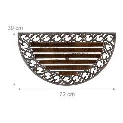 Die Türmatte aus Gusseisen ist mit ihren verspielten Ornamenten Dekoration und Fußabtreter in einem. Gummifüße an der Unterseite schützen den Boden vor Kratzern und verhindern Staunässe, sodass keine Rostflecken entstehen können. Das langlebige und wetterfeste Material lässt sich leicht mit mit Wasser reinigen. In seinem antiken Design fügt sich der Fußabstreifer ideal in Deko-Artikel im Jugendstil oder Landhaus-Stil ein. Die Fußmatte eignet sich auch als rutschhemmende Matte für Treppenstufen im Außenbereich.