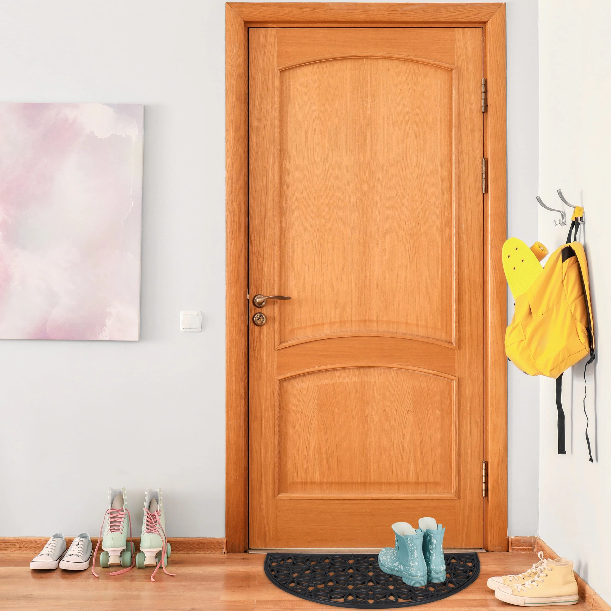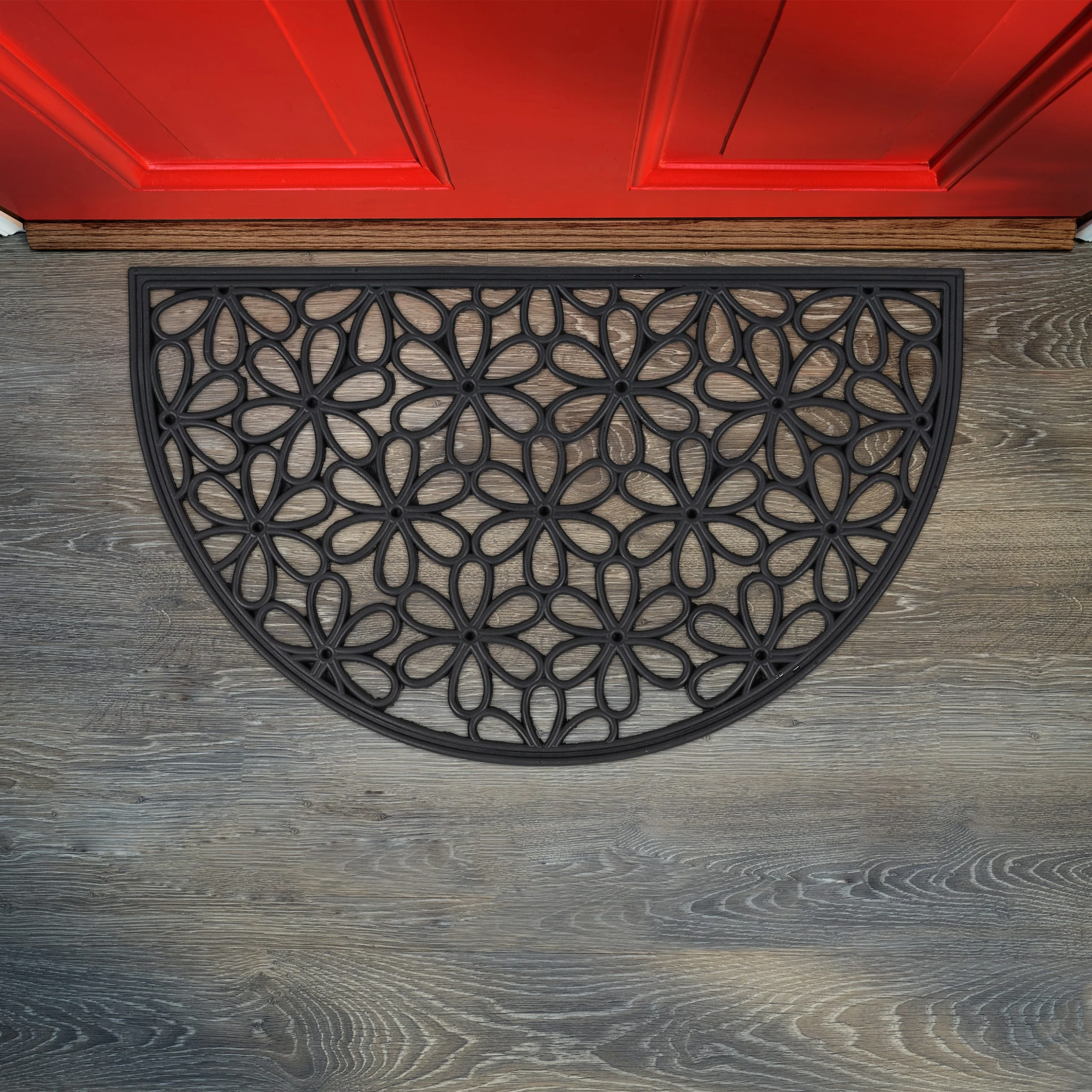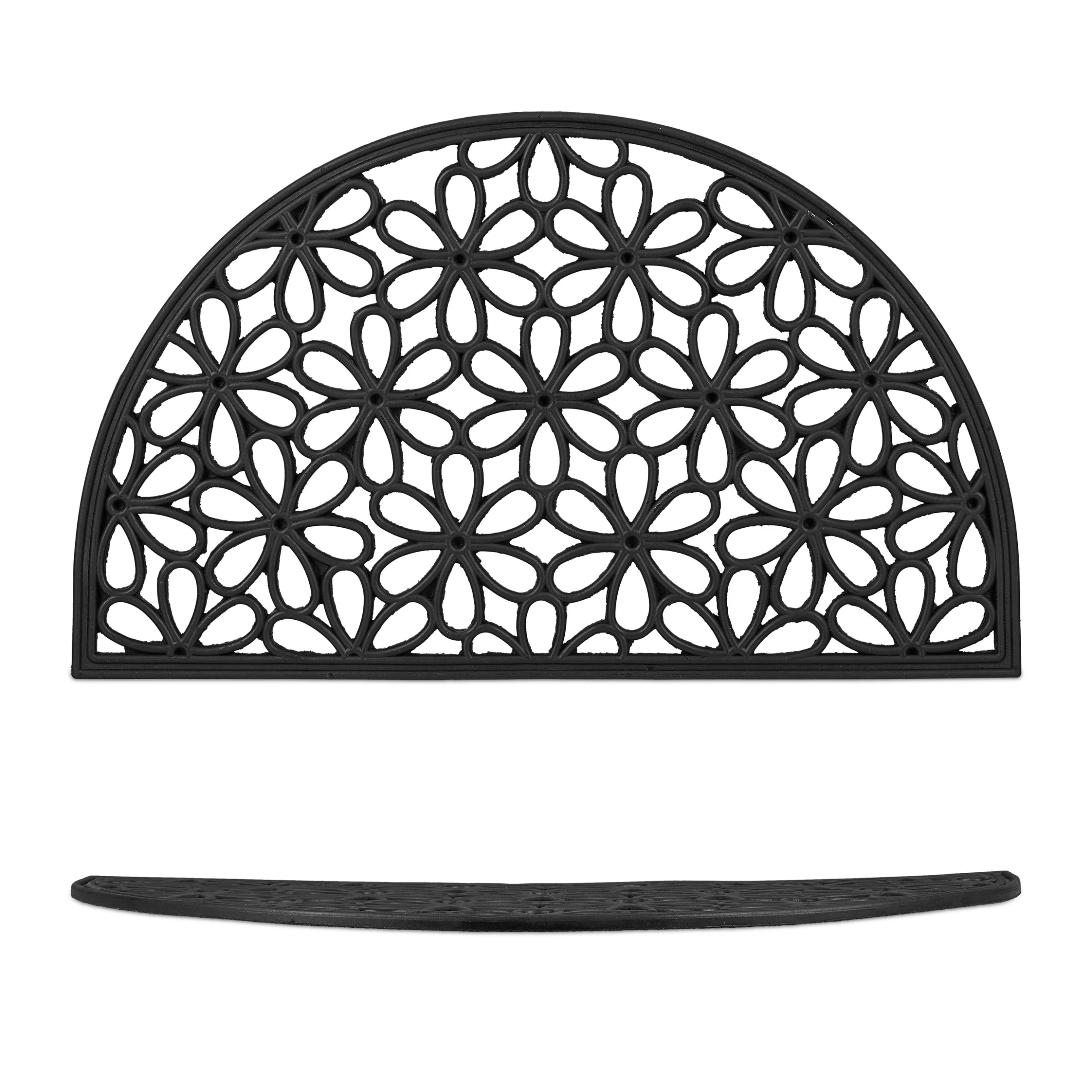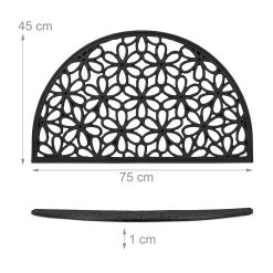 Die Fußmatte aus robustem Gummi ist ein praktischer Helfer, um lästigen Straßendreck von Deiner Wohnung fernzuhalten. Ebenso sticht der Fußabtreter dank seines dekorativen Blumenmusters in Schwarz optisch hervor und verschönert sowohl Deine Terrasse und Deinen Garten als auch die Innenräume Deiner Wohnung. Der Türvorleger trotzt jedem Wetter und haftet auch bei Schnee und Regen fest am Boden. Den Abtreter reinigst Du mit wenigen Handgriffen mit Wasser.