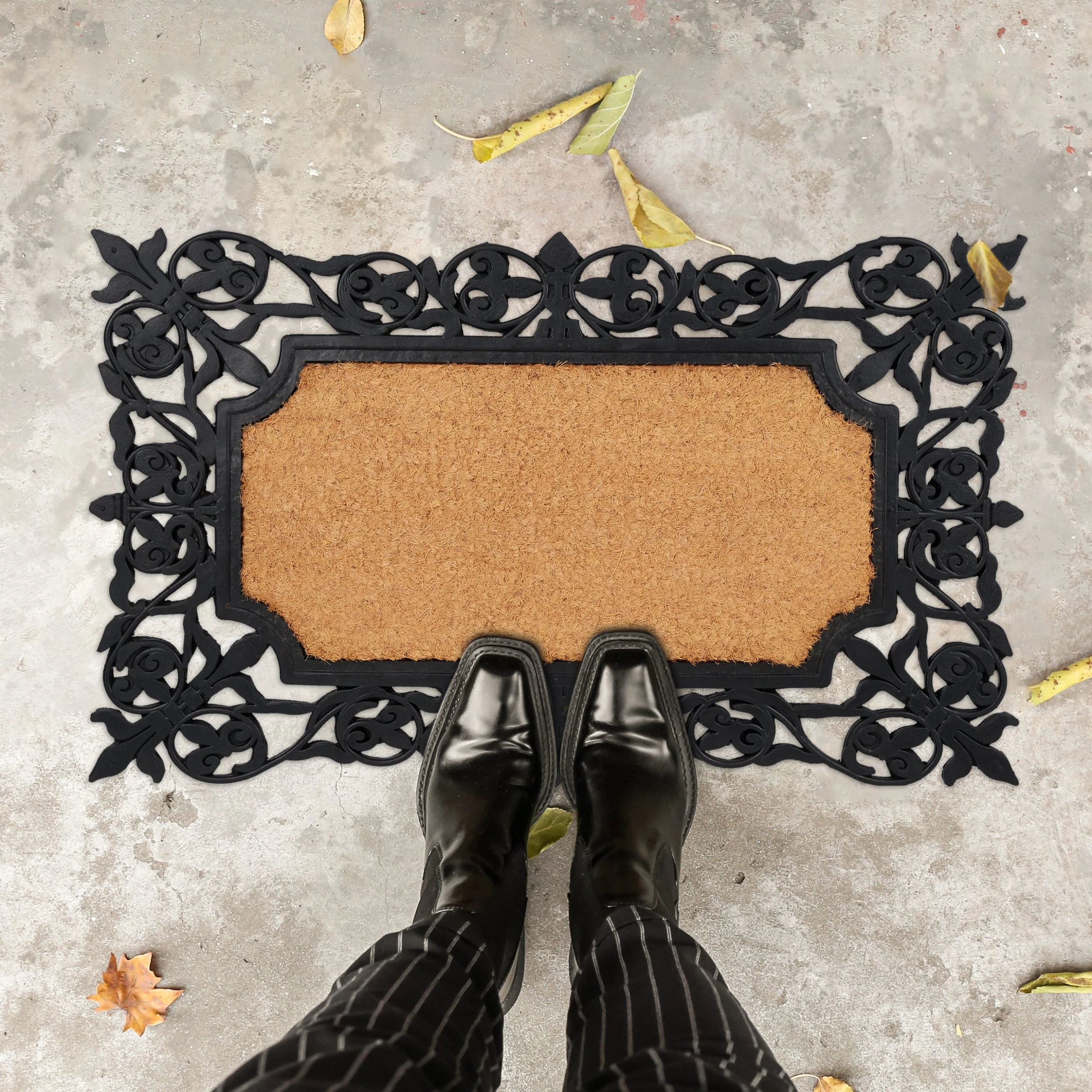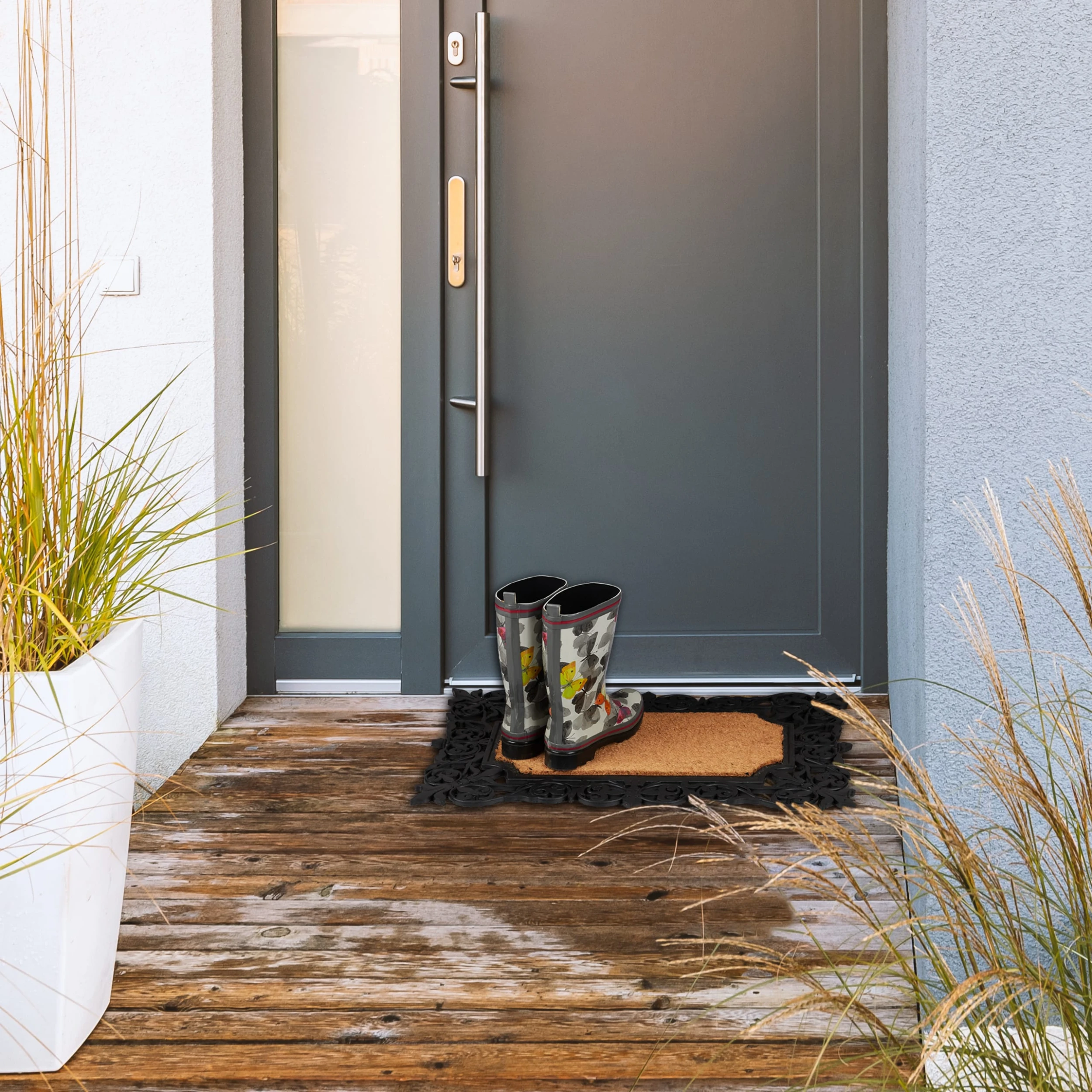 Mit dieser dekorativen Eingangsmatte vor der Haustür hältst Du Deine Innenräume zuverlässig sauber. Die wetterfeste Schuhmatte aus Gummi und Kokos kann dazu drinnen oder draußen platziert werden. Dank der rutschfesten Unterseite haftet die Schmutzmatte beim Abtreten der Schuhe fest am Boden. Über seine praktischen Eigenschaften hinaus überzeugt der Fußabtreter ebenso mit ansprechendem Design. Der Mix aus schwarzen Ornamenten und Naturfasern ist ein echter Blickfang für jeden Eingangsbereich.