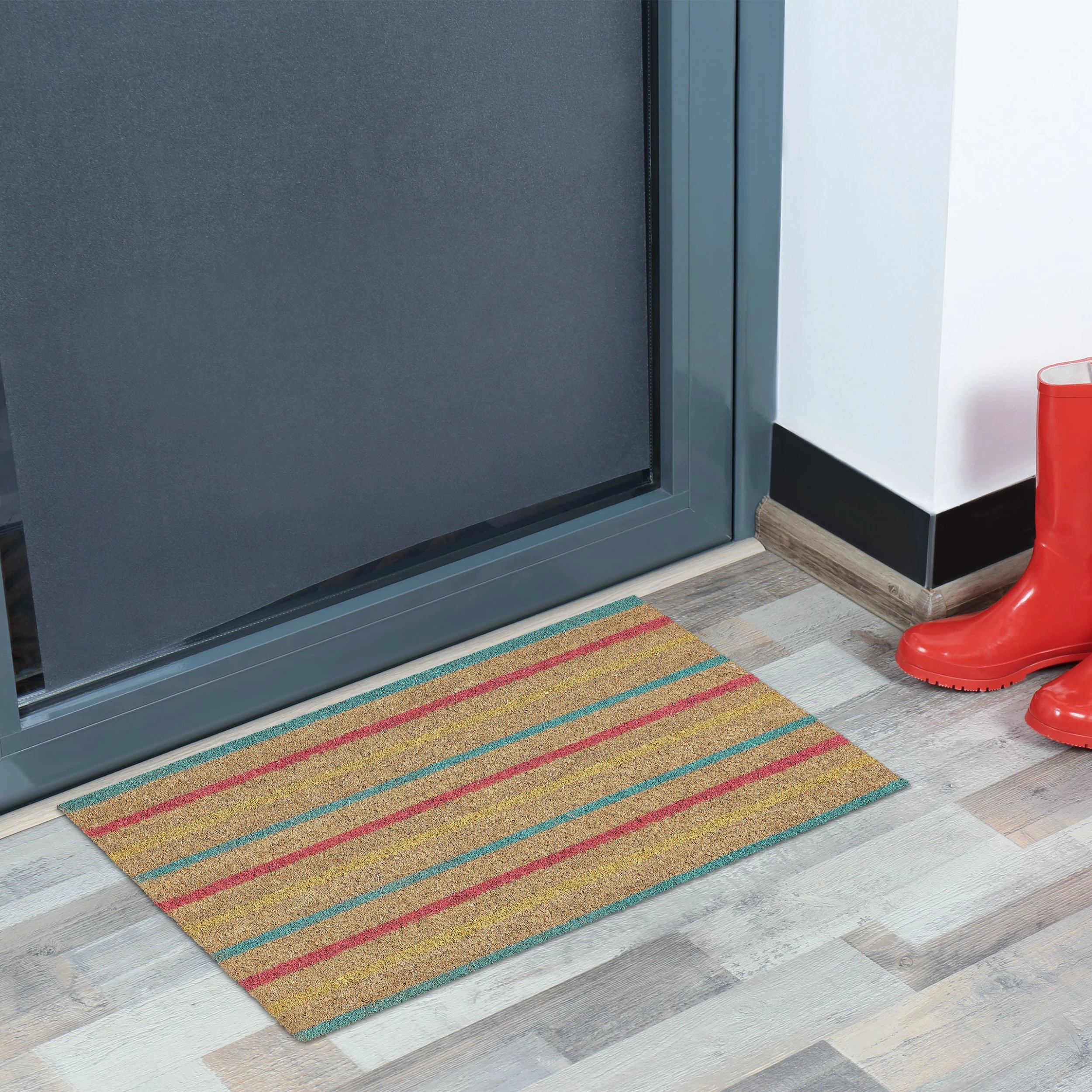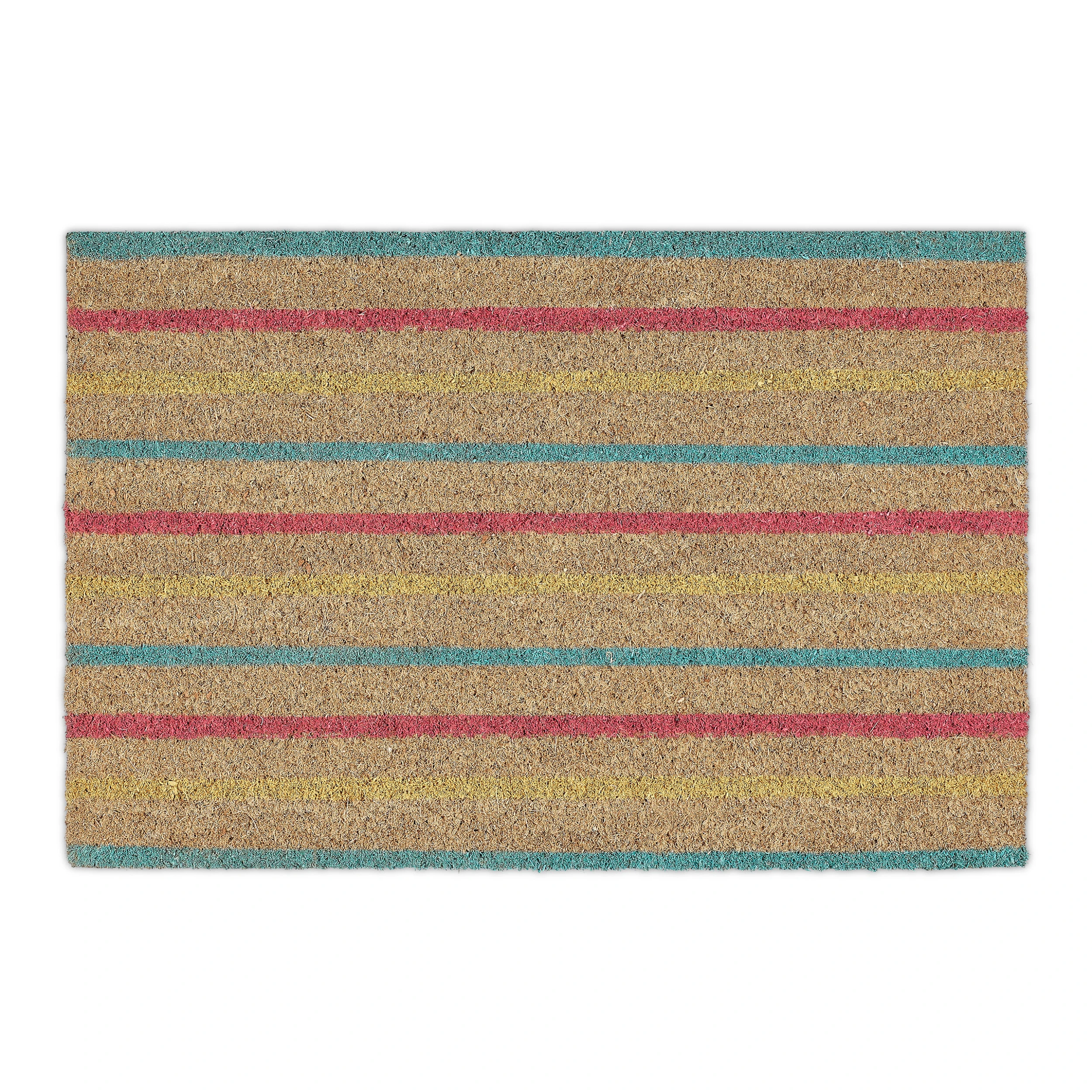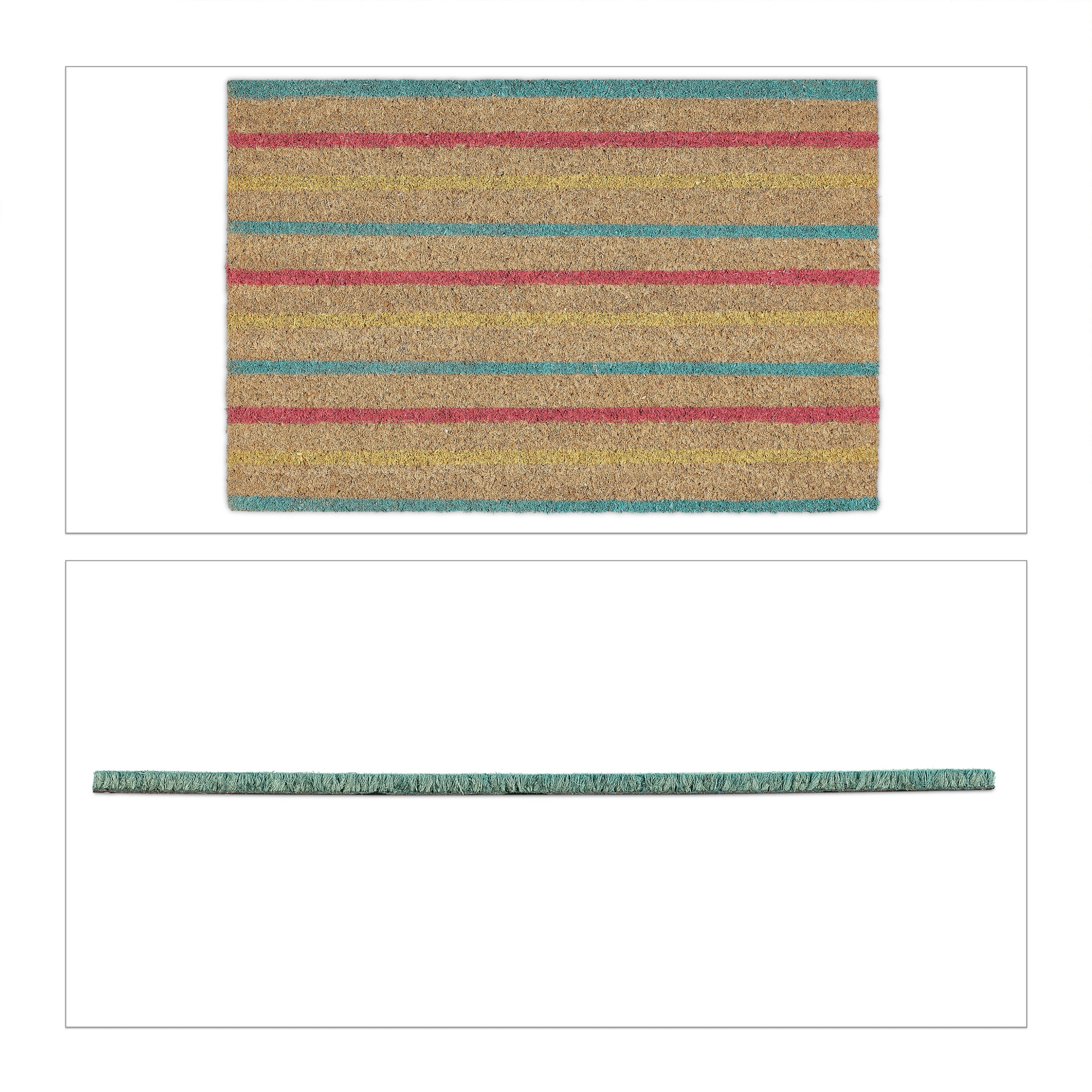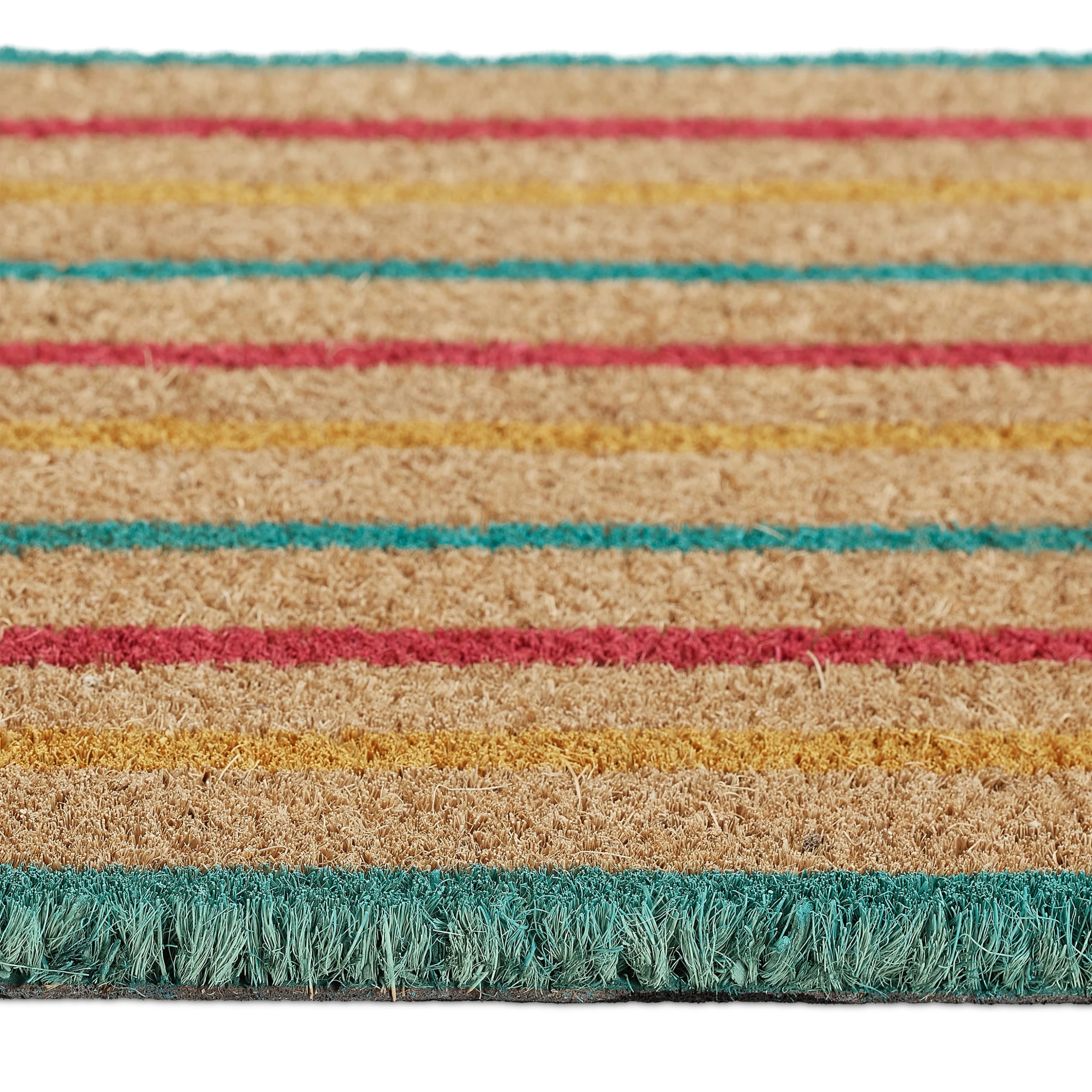 Mit dieser modernen Fußmatte im farbenfrohen Look markieren Sie den Eingang zu Ihrer Wohnung auf eine originelle Art. Doch der Türvorleger punktet nicht nur mit seinem dekorativen Streifenmotiv. Durch die natürlichen Kokosfasern ist die Türmatte robust und langlebig. Dank wetterfester Eigenschaften des umweltfreundlichen Rohstoffs kann der Fußabstreifer innen und außen genutzt werden. Die Unterseite besteht aus rutschfestem PVC, sodass der Schuhabtreter an seinem angestammten Platz bleibt.