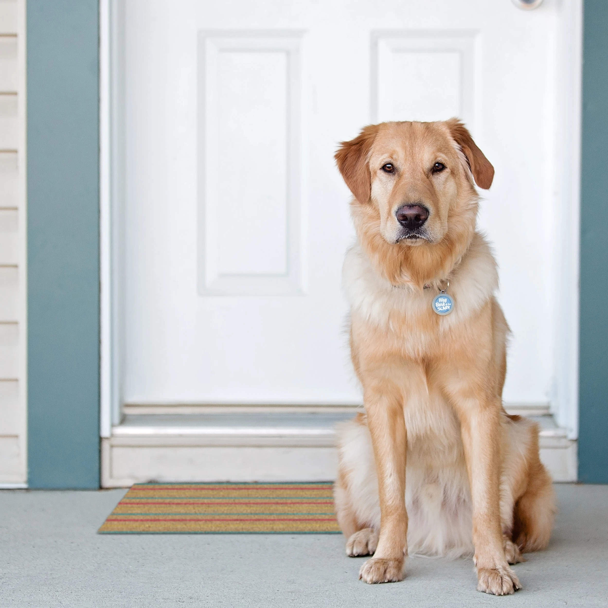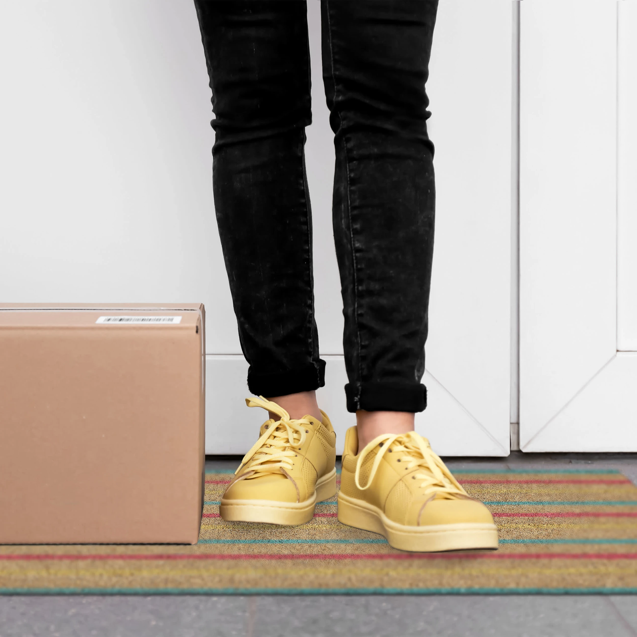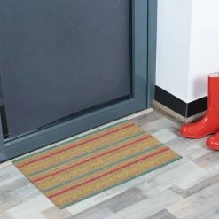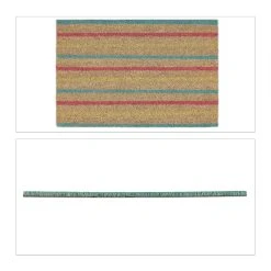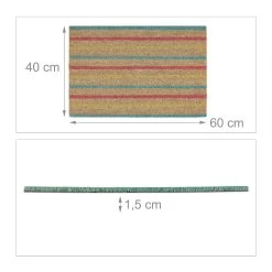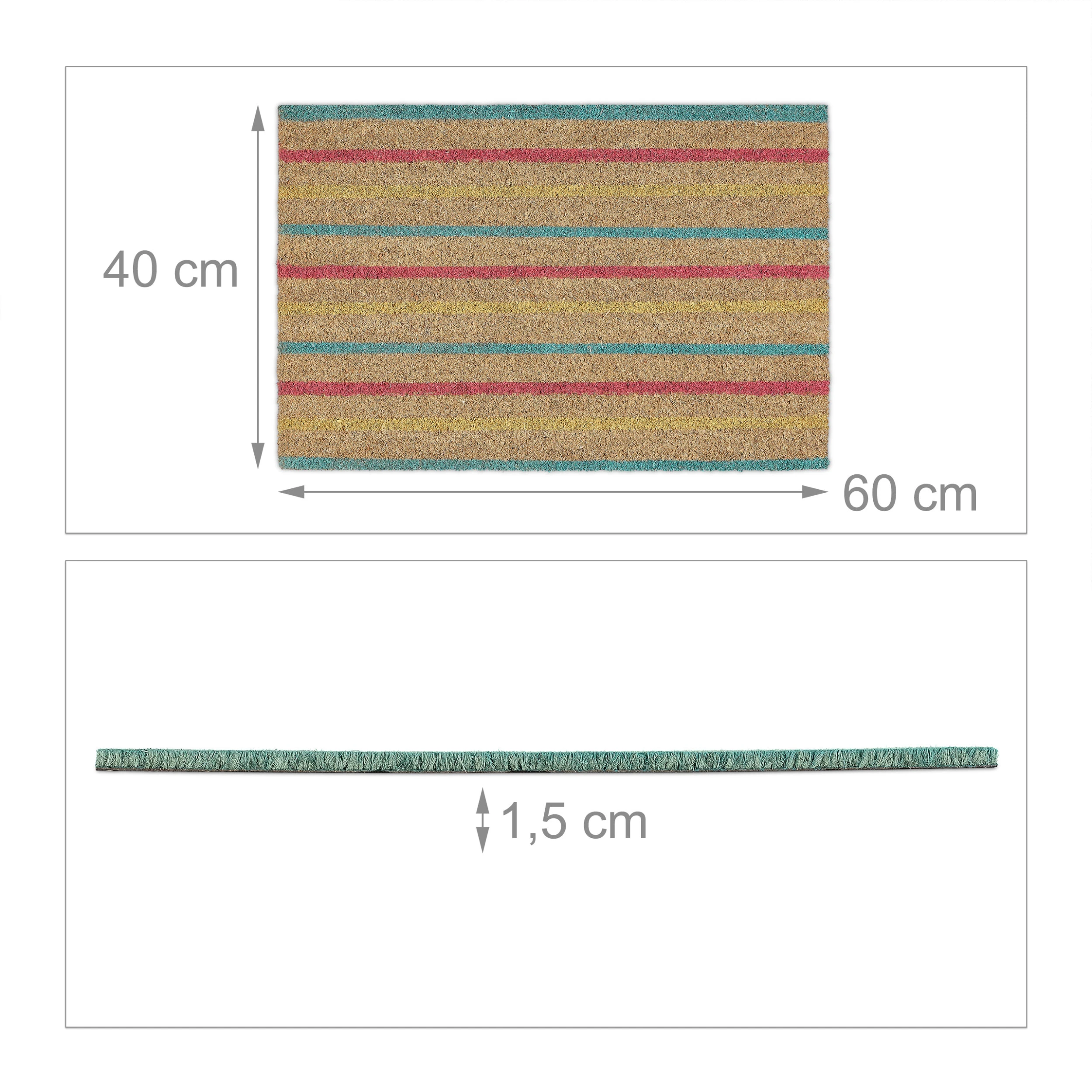 Mit dieser modernen Fußmatte im farbenfrohen Look markieren Sie den Eingang zu Ihrer Wohnung auf eine originelle Art. Doch der Türvorleger punktet nicht nur mit seinem dekorativen Streifenmotiv. Durch die natürlichen Kokosfasern ist die Türmatte robust und langlebig. Dank wetterfester Eigenschaften des umweltfreundlichen Rohstoffs kann der Fußabstreifer innen und außen genutzt werden. Die Unterseite besteht aus rutschfestem PVC, sodass der Schuhabtreter an seinem angestammten Platz bleibt.