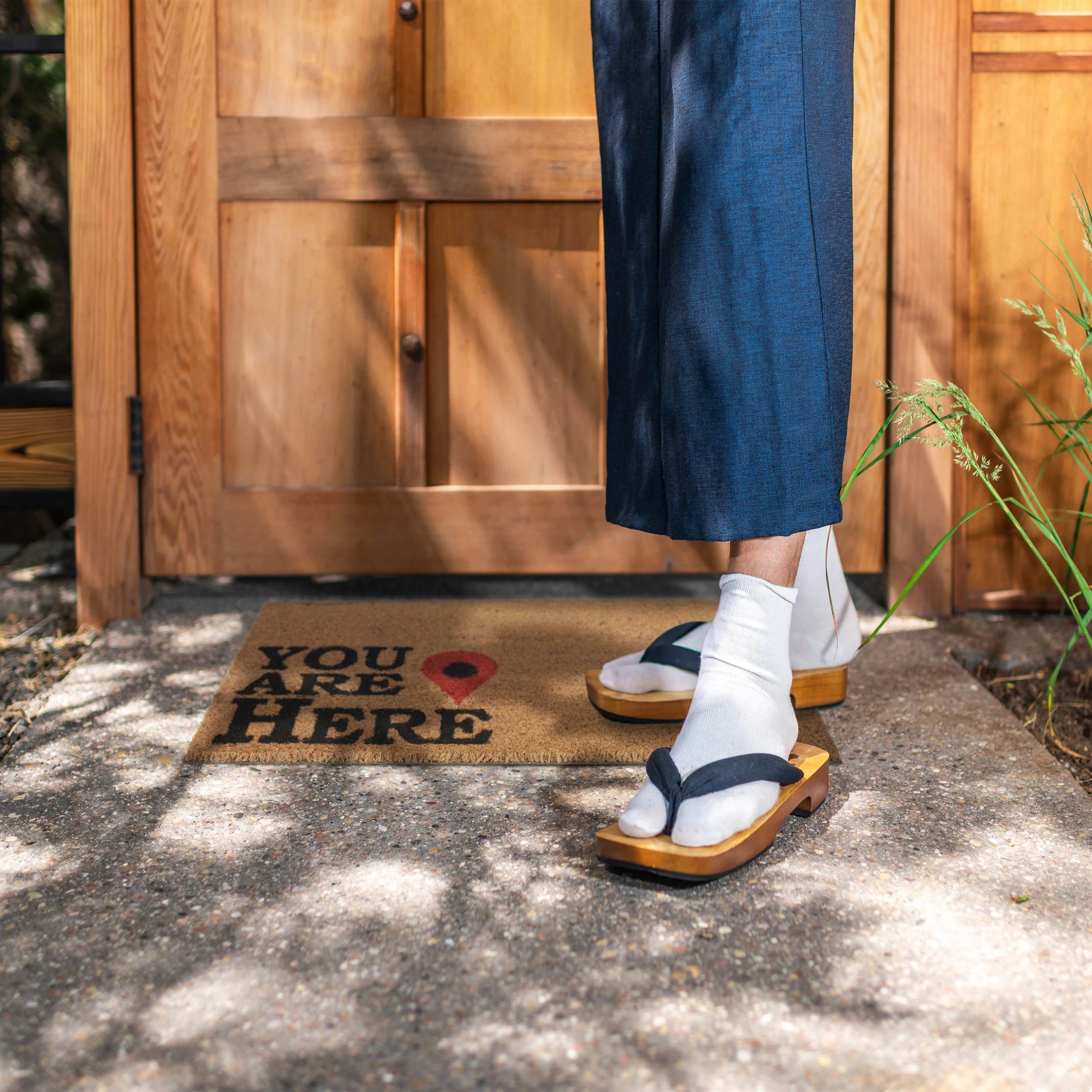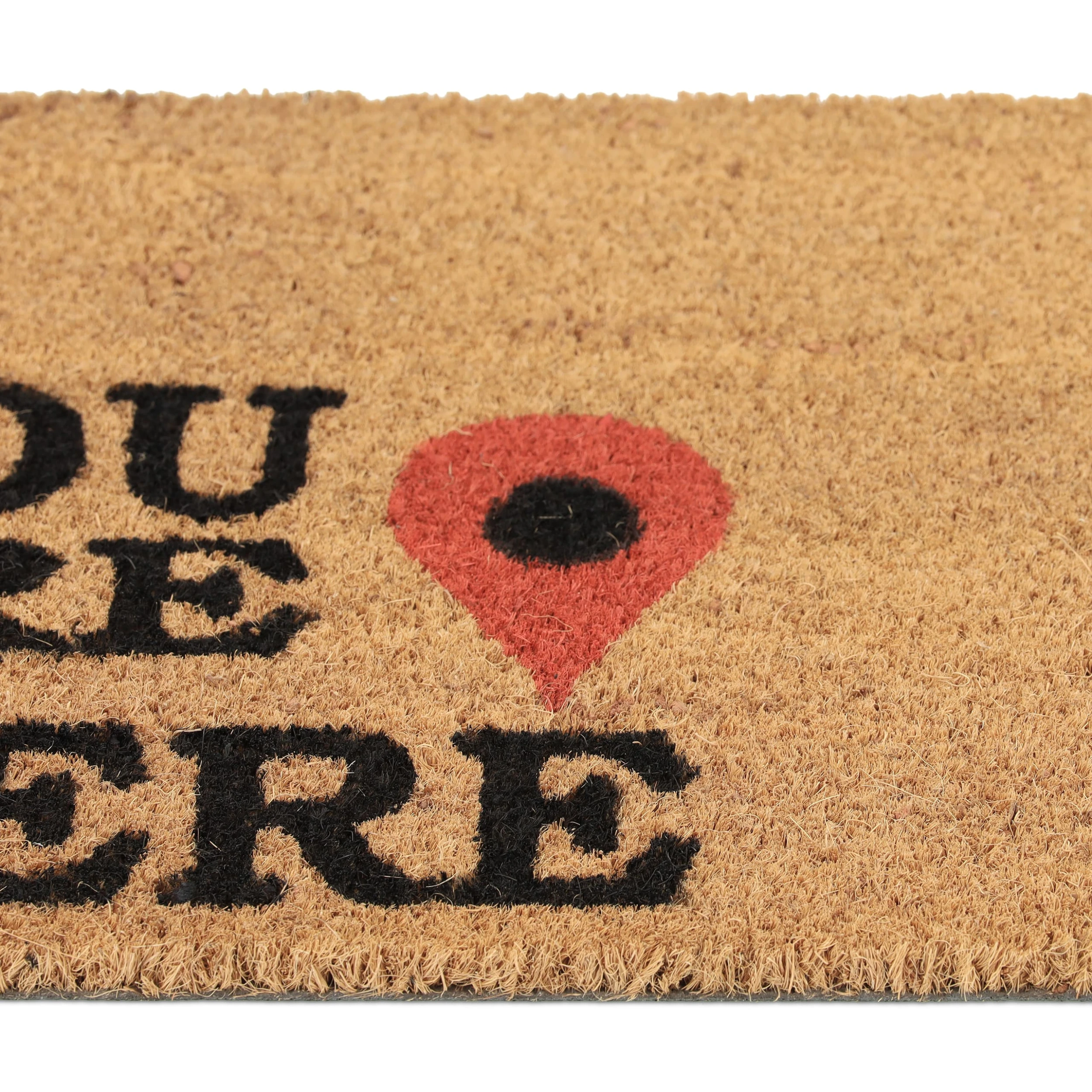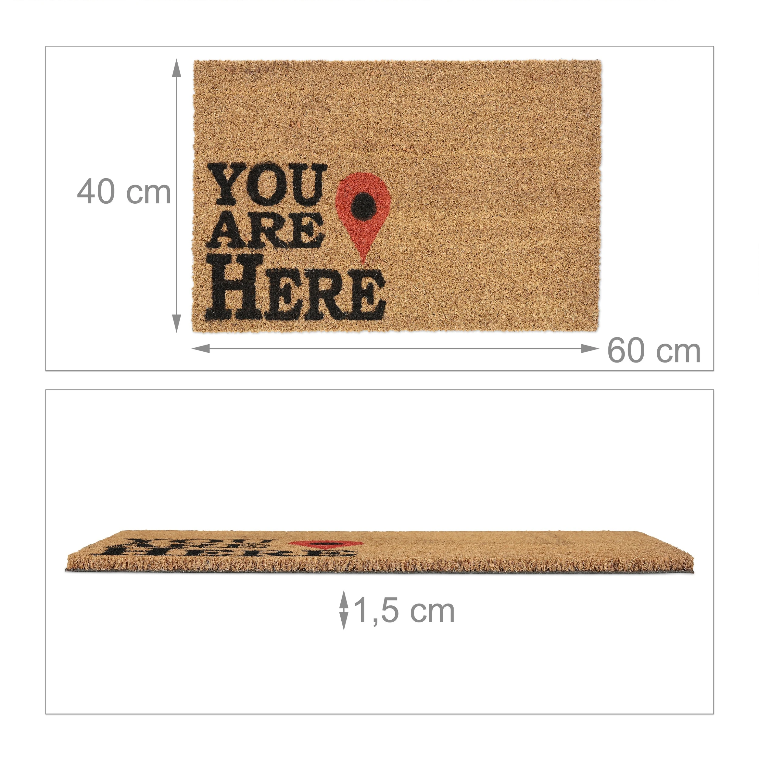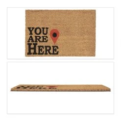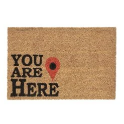 Mit dieser lustigen Haustürmatte mit “You are here”-Aufschrift verleihst Du Deinem Eingangsbereich einen einladenden Look und sorgst gleichzeitig für saubere Innenräume. Durch die natürlichen Kokosfasern ist die Türmatte robust und wetterfest und kann sowohl drinnen als auch draußen vor der Haustür oder auf der Terrasse genutzt werden. Die Unterseite des Fußabstreifers besteht aus rutschfestem PVC, sodass der Schuhabtreter an seinem angestammten Platz bleibt.
