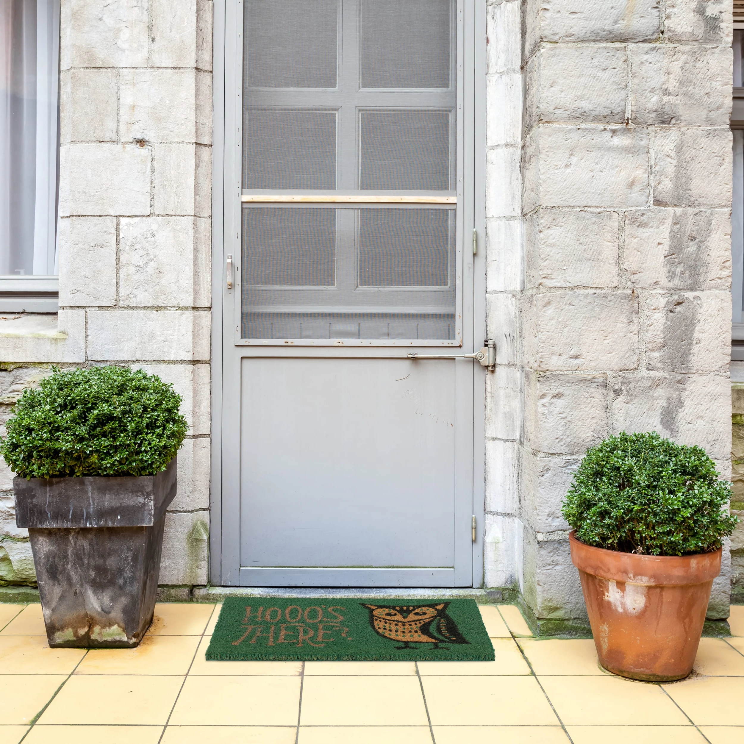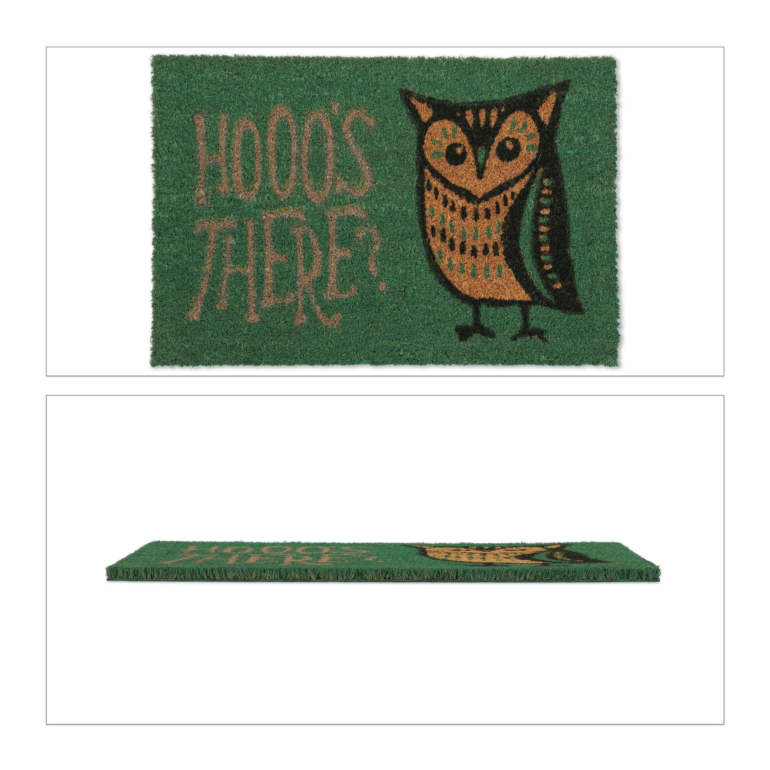Mit dieser originellen Haustürmatte verleihst Du Deinem Eingangsbereich einen einladenden Look. Die kleine Eule erkundigt sich, wer da ist und zaubert deinen Gästen noch vor dem Türöffnen ein Lächeln ins Gesicht. Durch die natürlichen Kokosfasern ist die Türmatte robust und wetterfest und kann sowohl drinnen als auch draußen genutzt werden. Die Unterseite des Fußabstreifers besteht aus rutschfestem PVC, sodass der Schuhabtreter an seinem angestammten Platz bleibt.