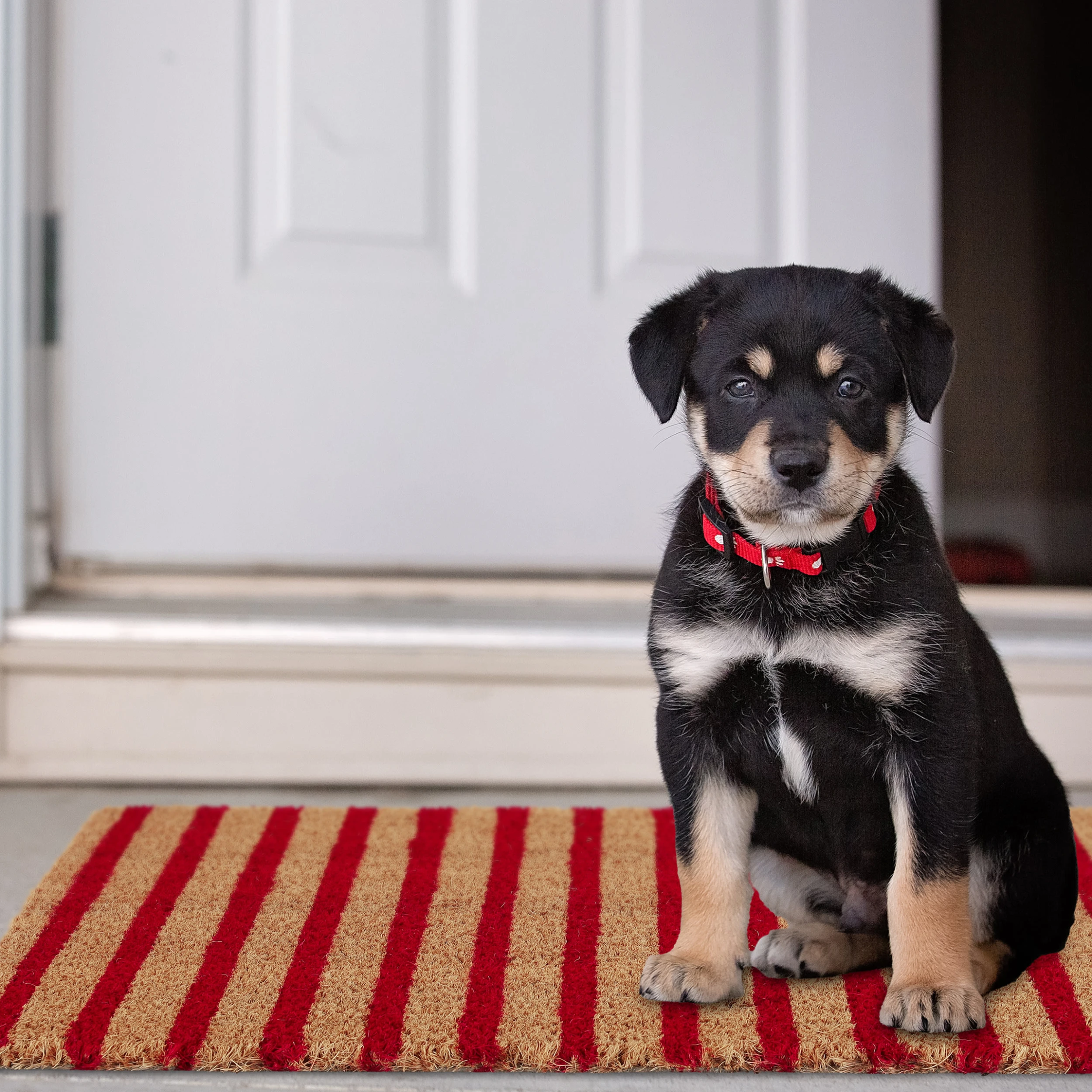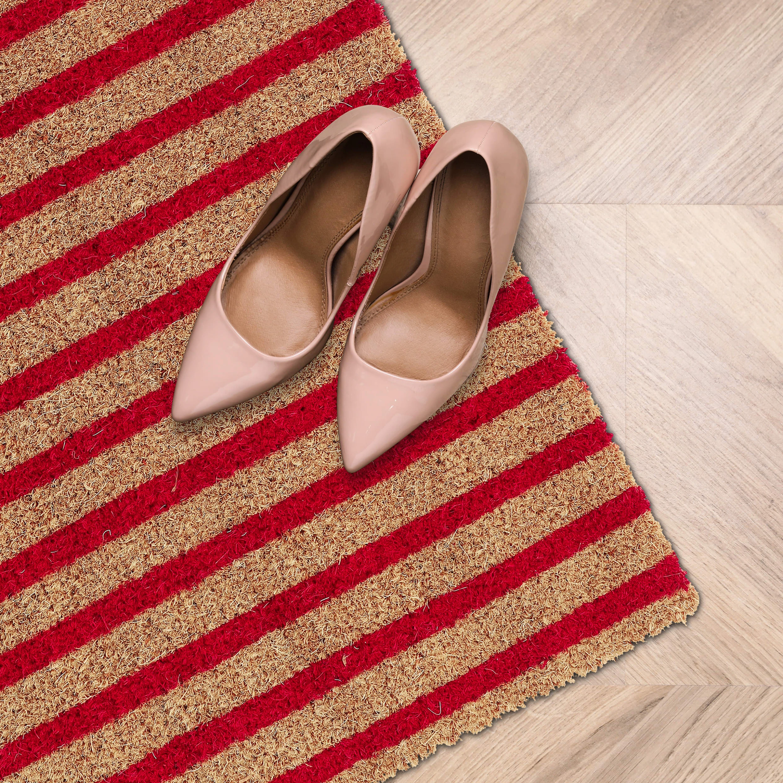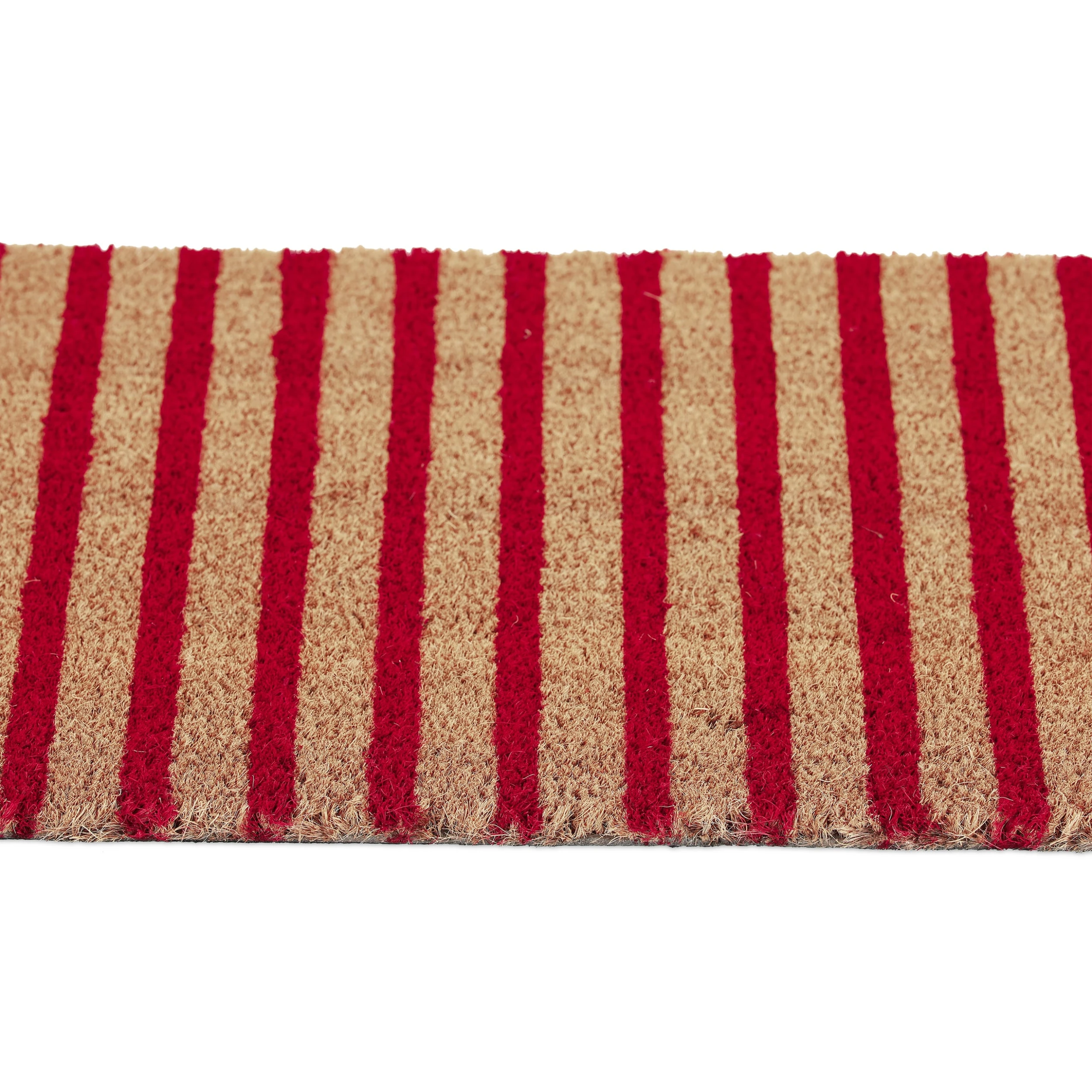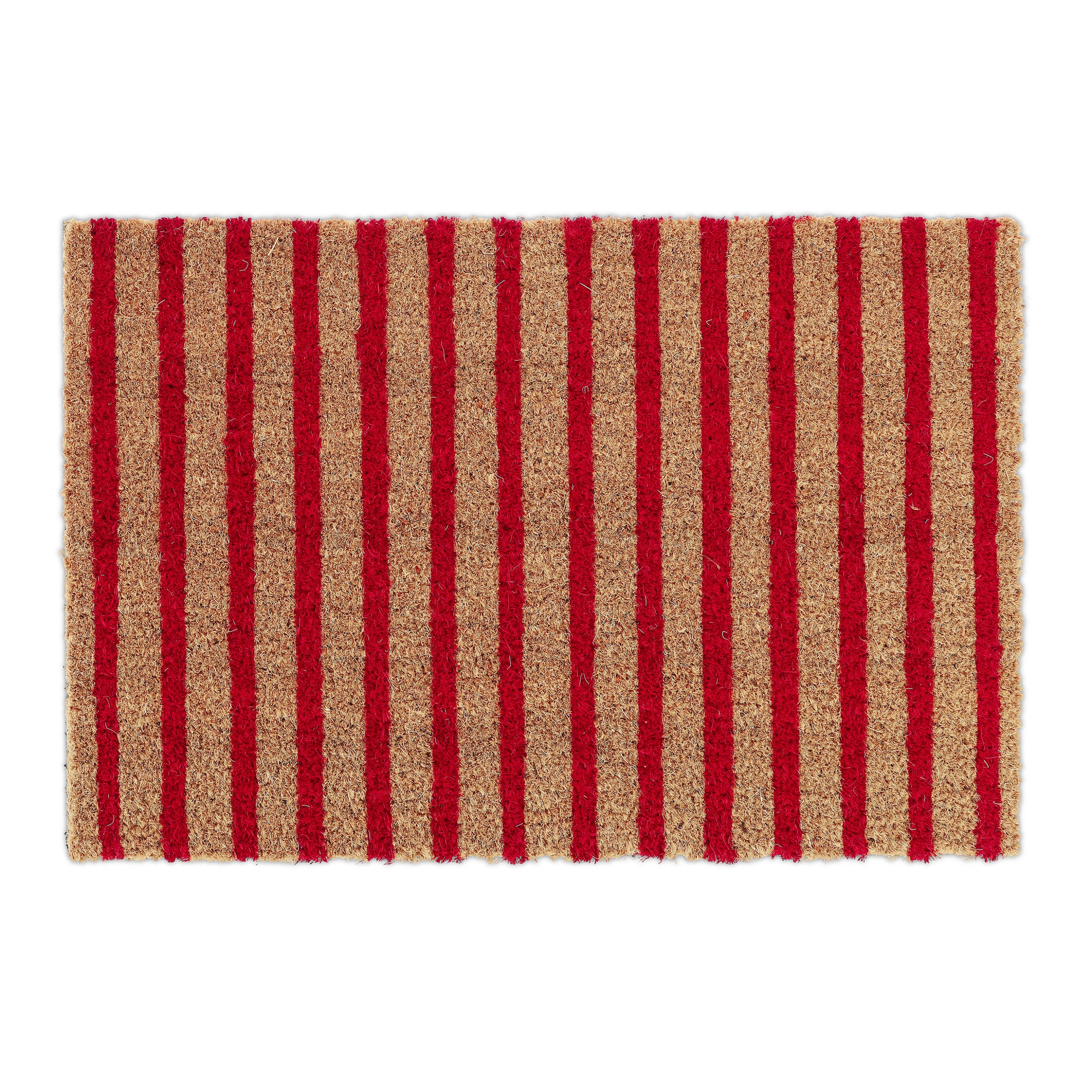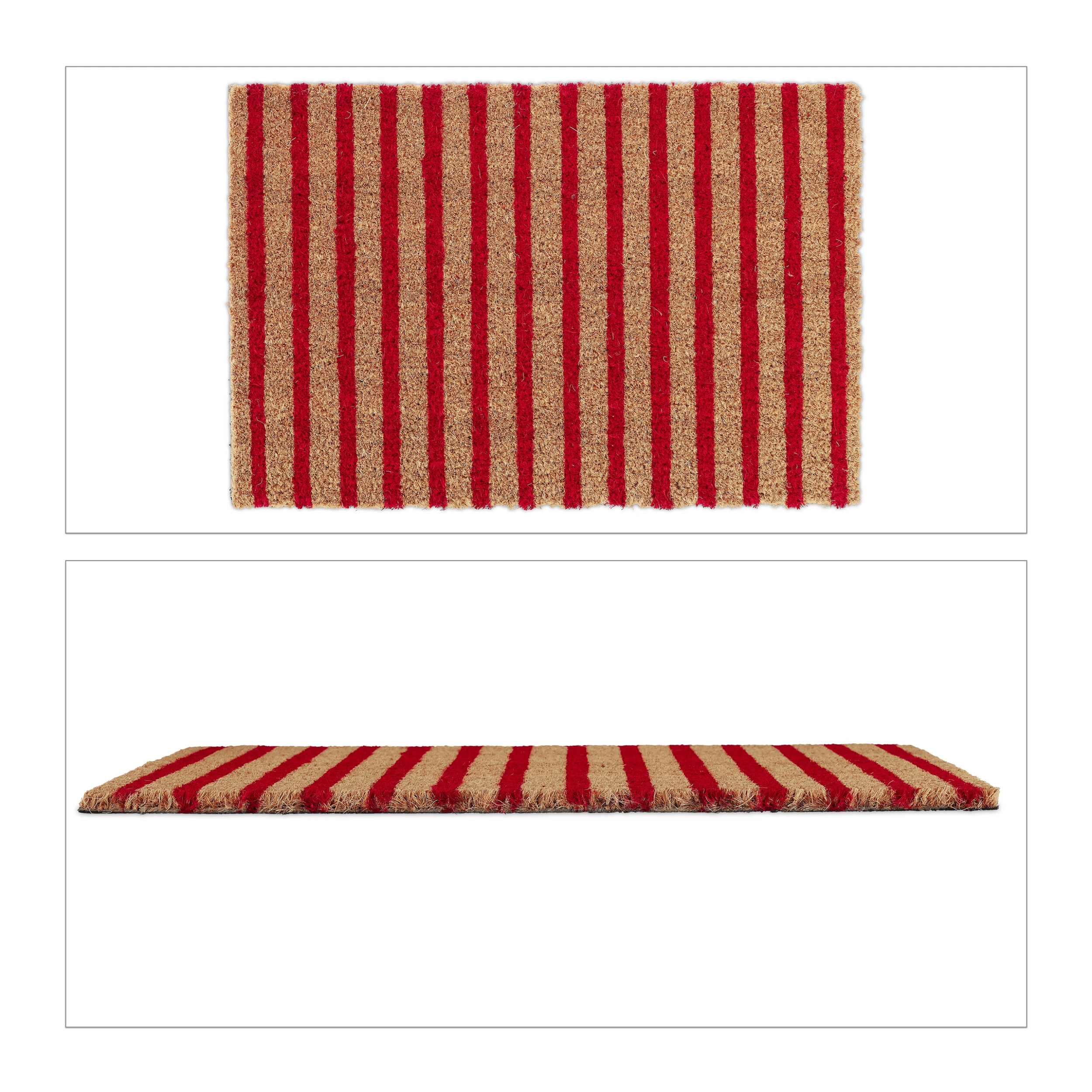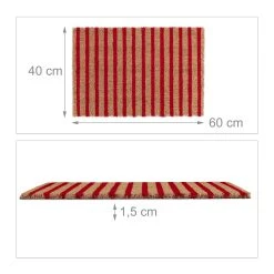 Mit dieser dekorativen Haustürmatte verleihst Du Deinem Eingangsbereich einen einladenden Look und sorgst für saubere Innenräume. Doch der Schmutzabtreter punktet nicht nur mit seinem zurückhaltenden Streifendesign in Natur und Rot. Durch die natürlichen Kokosfasern ist die Türmatte robust und wetterfest und kann sowohl drinnen als auch draußen genutzt werden. Die Unterseite des Fußabstreifers besteht aus rutschfestem PVC, sodass der Schuhabtreter an seinem angestammten Platz bleibt.