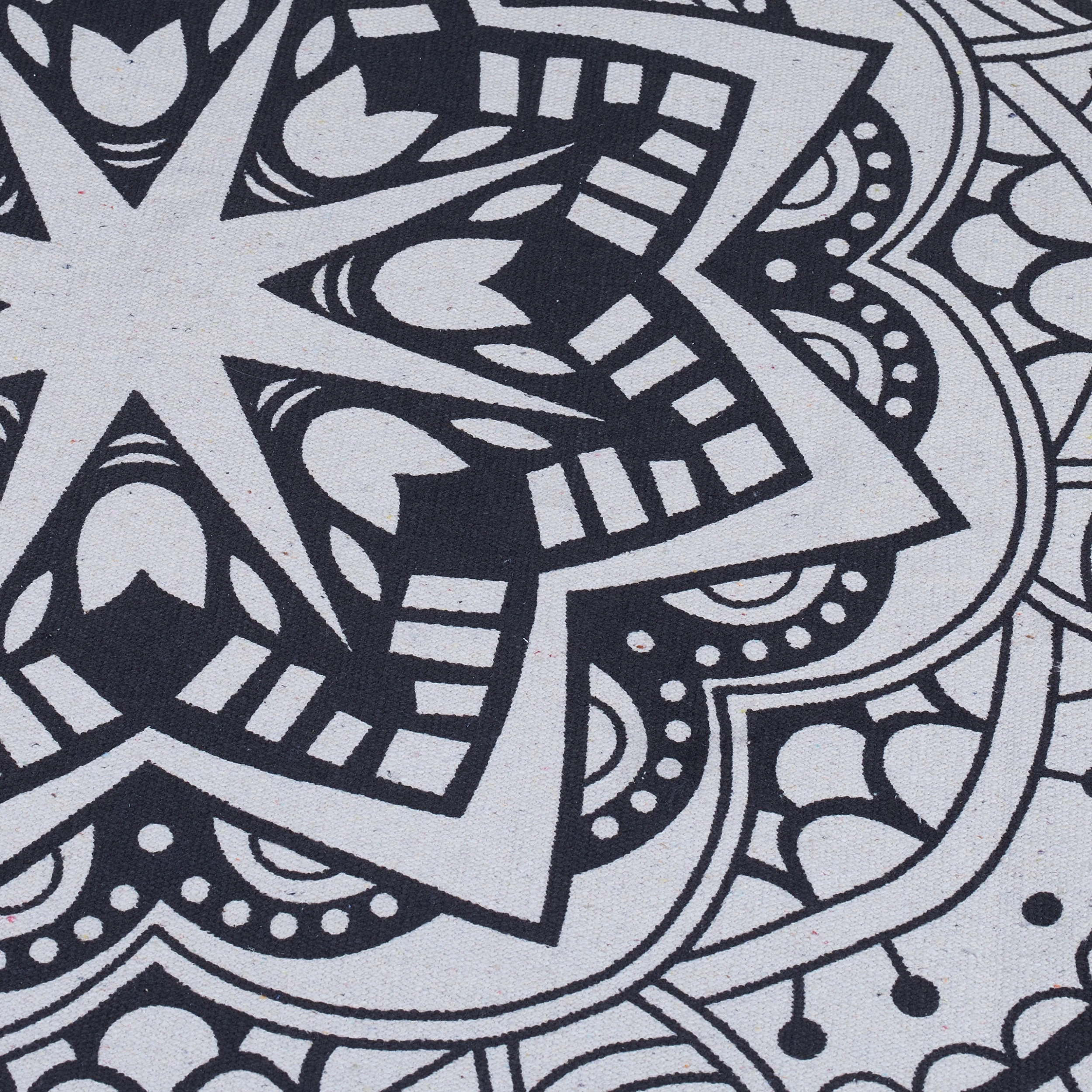 Mit diesem dekorativen Rundteppich holst Du Dir ein gemütliches Wohnaccessoire in den Flur, das Wohn- oder Schlafzimmer. Durch sein schwarzes Mandala-Design auf cremefarbenem Grund versprüht der Teppichläufer in jedem Raum angesagten Boho-Flair. Der Fransenteppich besteht vollständig aus Baumwolle und ist angenehm weich unter den Füßen. Dank des Sprühlatex auf der Unterseite rutscht der Baumwollteppich auch auf glattem Untergrund wie Parkett oder Fliesen nicht weg.