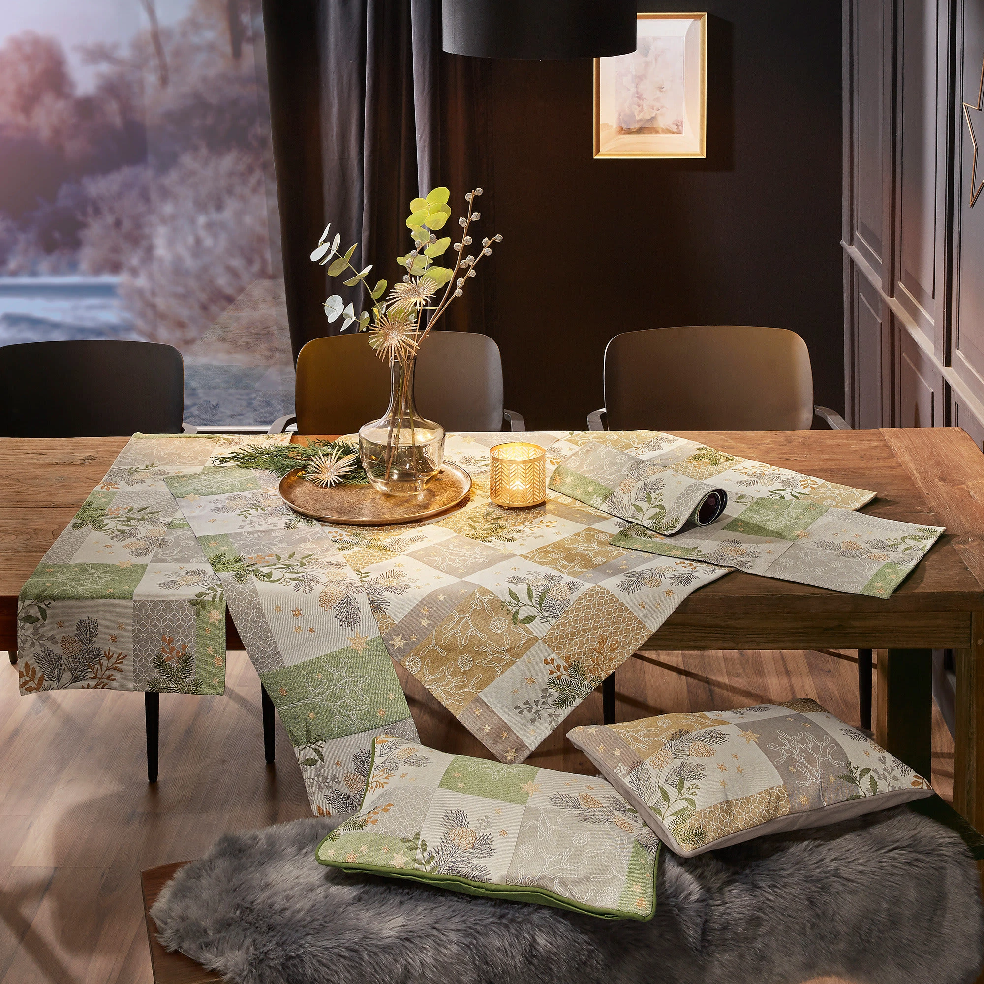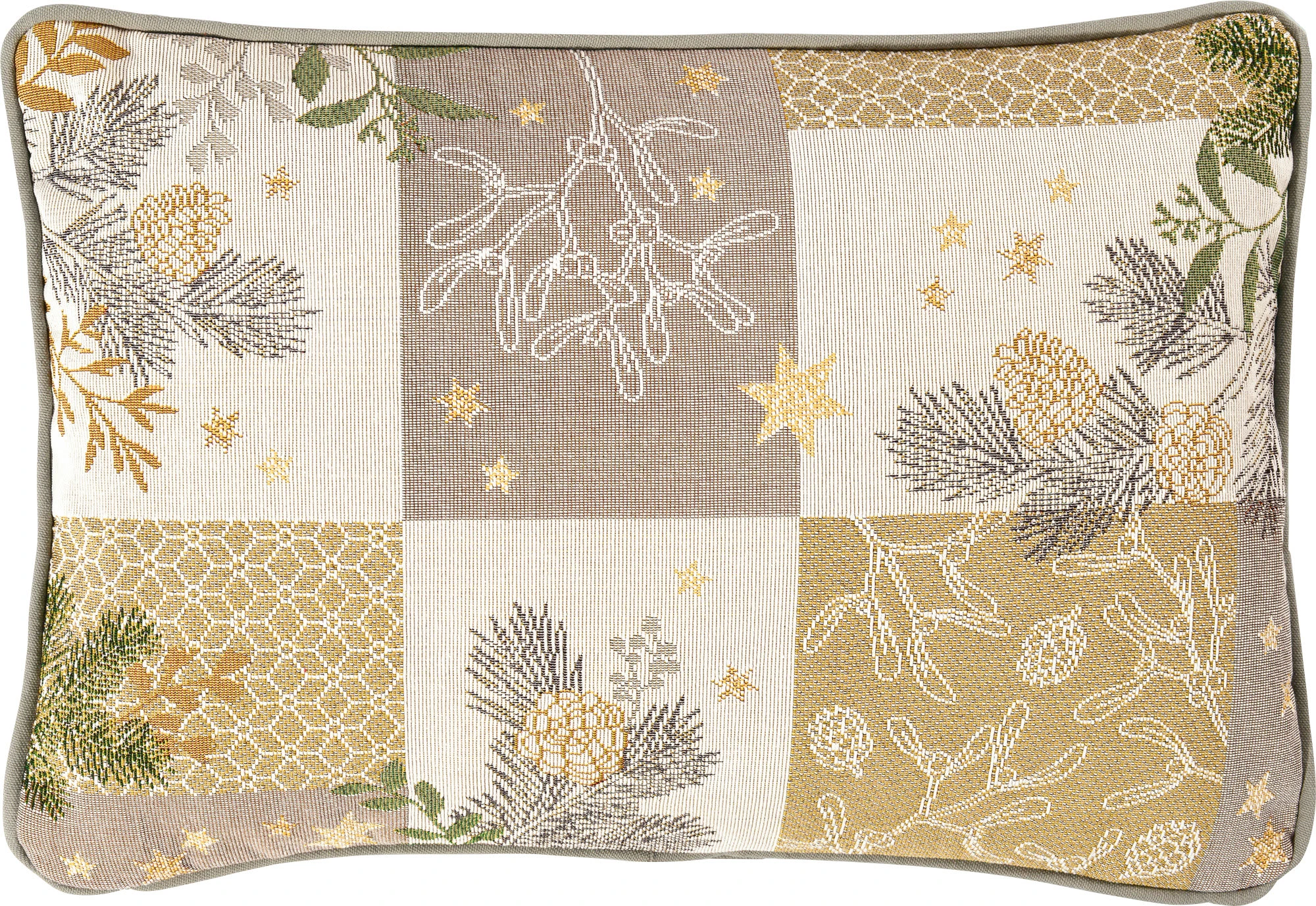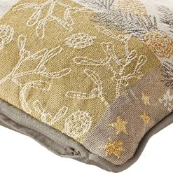 Sander Gobelin Kissenhülle “Belle Patch”. Verziert mit Zweigen, Beeren und Sternen in fröhlicher Patchwork-Optik wirkt das Motiv dezent und natürlich. Mit viel Liebe zum Detail wurde das Motiv kunstvoll in den ganz besonderen Stoff gewebt. Diese exklusive Textilqualität begeistert durch ihren rustikalen Charme, sie zeigt sich edel und robust zugleich. Pflegeleicht, strapazierstark und beständig. Mit umlaufendem Keder. Rückseite aus Canvas-Gewebe in Uni.