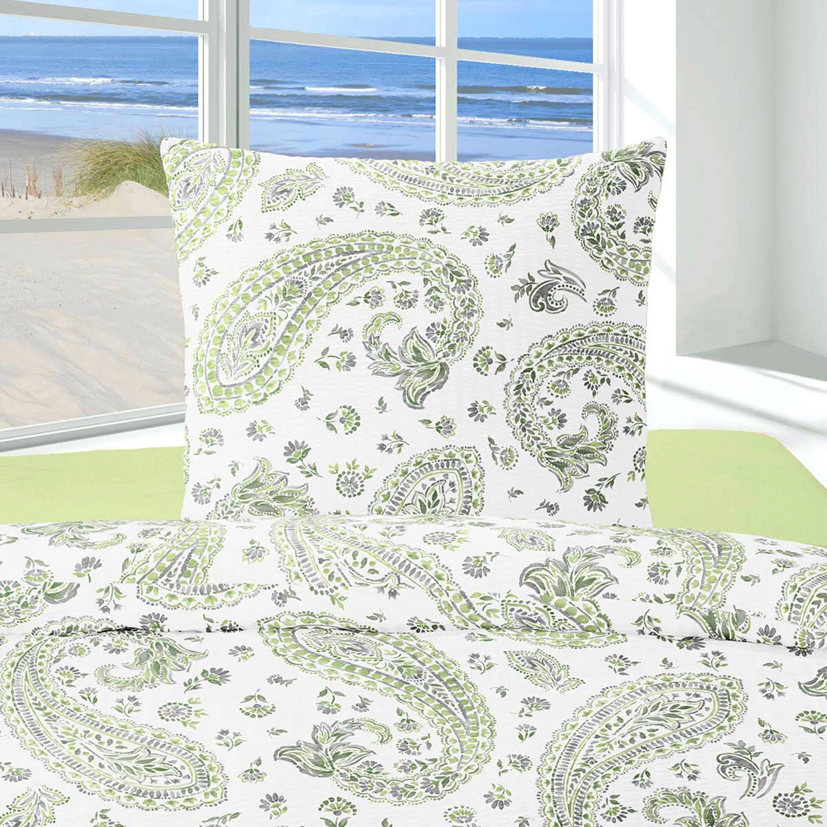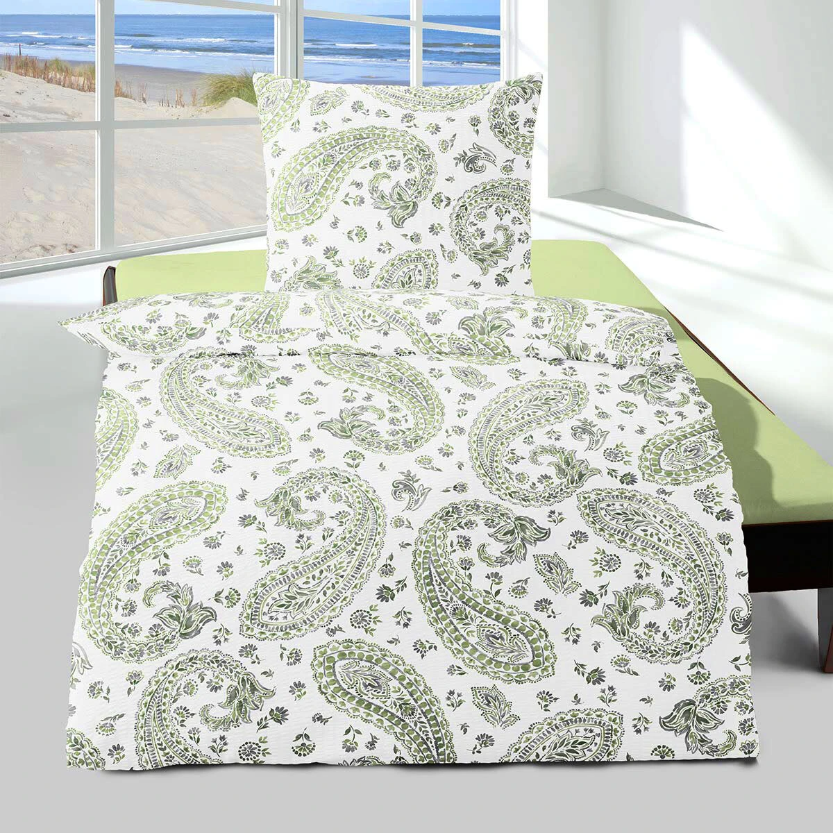 Weiche Seersucker Bettwaren in gekräuselter Baumwolle. Perfekte Bettwäsche in frischer Optik für die heißen Sommernächte. Das Material liegt durch die Kräuselstreifen nicht direkt auf der Haut auf und wirkt dadurch besonders luftig und angenehm leicht.