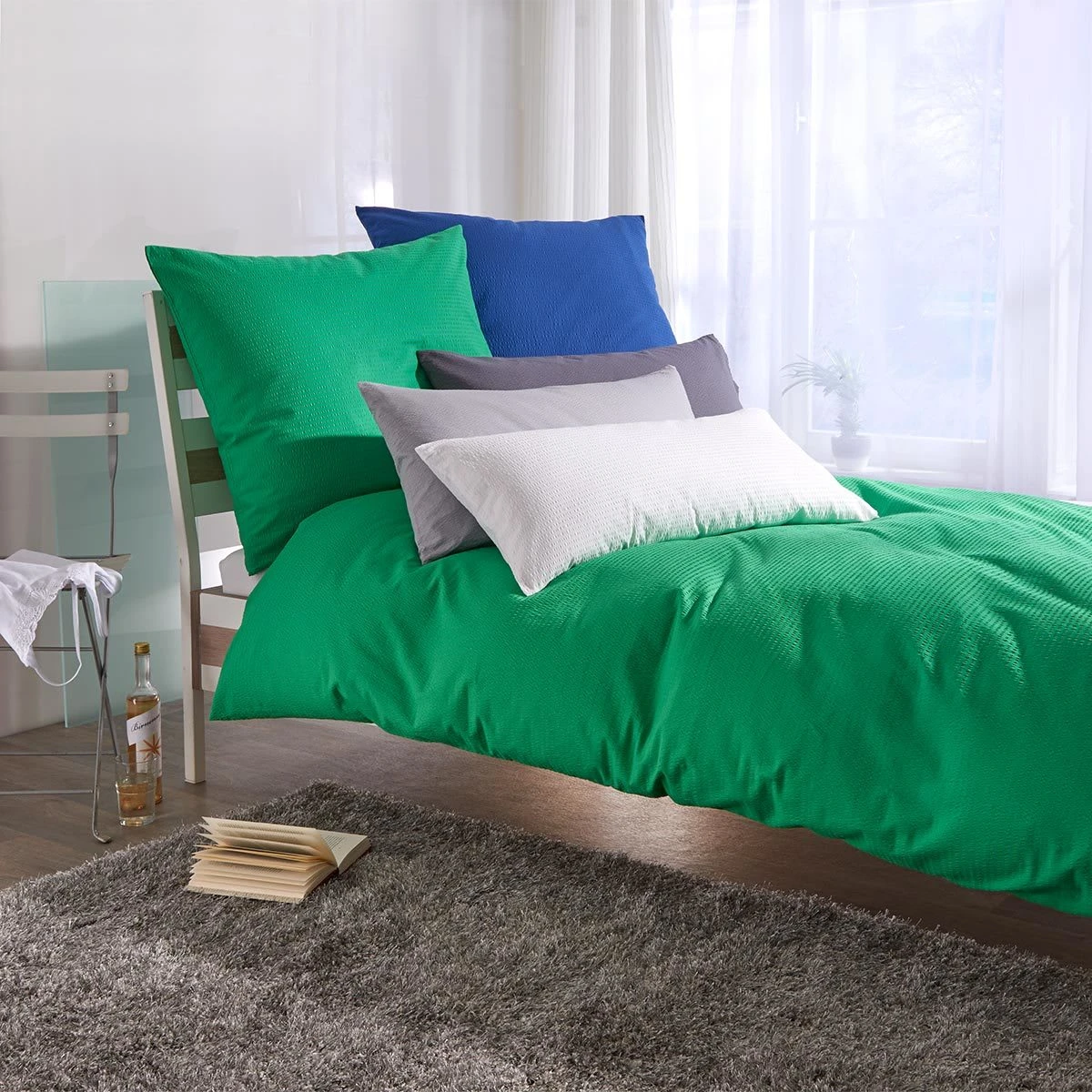 Die hochwertige Verarbeitung und die für Seersucker typische Krepp-Struktur sind weitere Merkmale dieser Uni Garnituren.