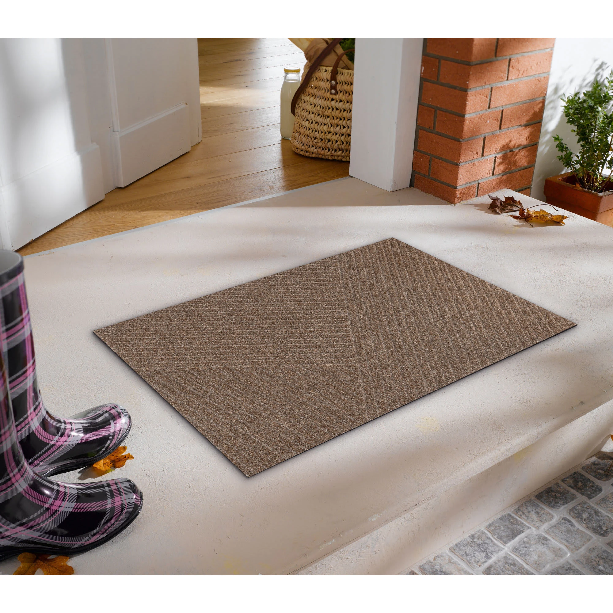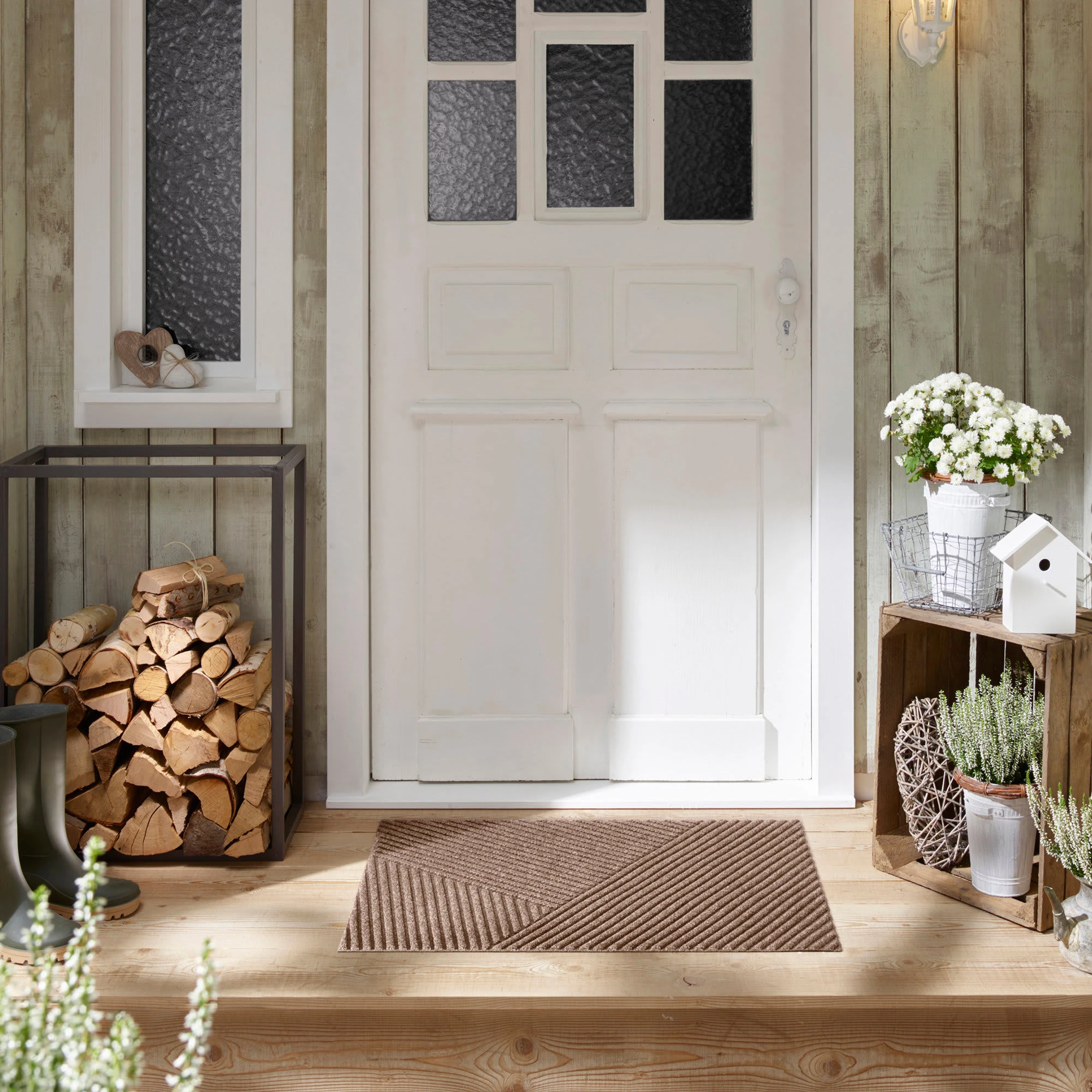 Wash+dry Fußmatte “Dune Stripes”. Diese robuste Matte ist mit einer groben 3-dimensionalen Oberflächenstruktur gefertigt. Somit kann Wasser durch die tieferliegenden Rinnen aufgefangen werden und darin abfließen. Perfekt für den Einsatz im geschützten Außenbereich, jedoch ebenso für den Wohnraum verwendbar. Die Matte hält Schmutz und Nässe zurück und Ihr Eingangsbereich bleibt länger sauber. Hergestellt mit einem Anteil recycelter Materialien. Rutschfest, langlebig und strapazierfähig. Pflegehinweis: